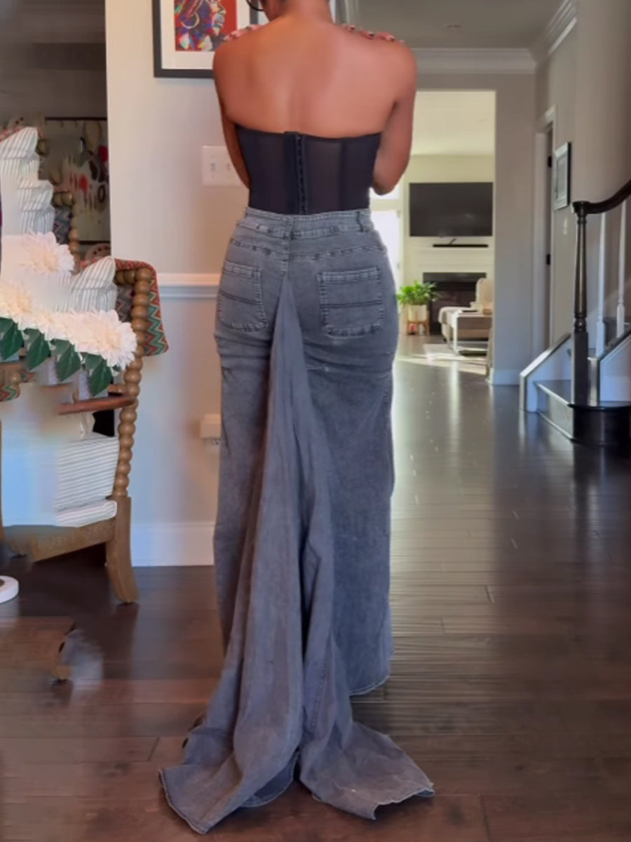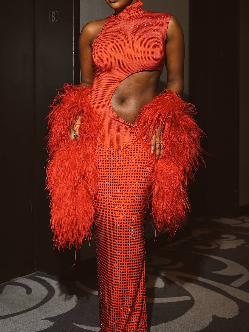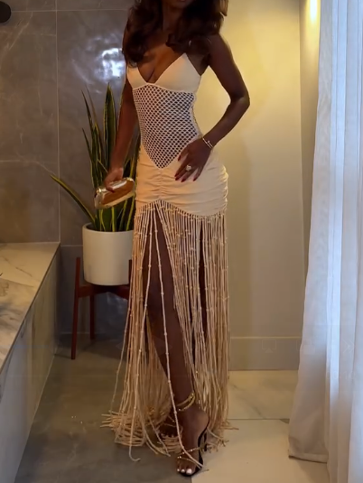 Mesh Pleated Hip-Wrap Tassel Maxi Dress