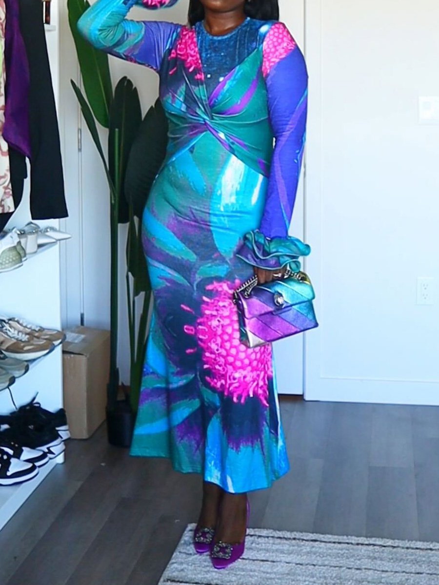 Sexy Long Sleeve O Neck Mesh Printed Ruffles Maxi Dress