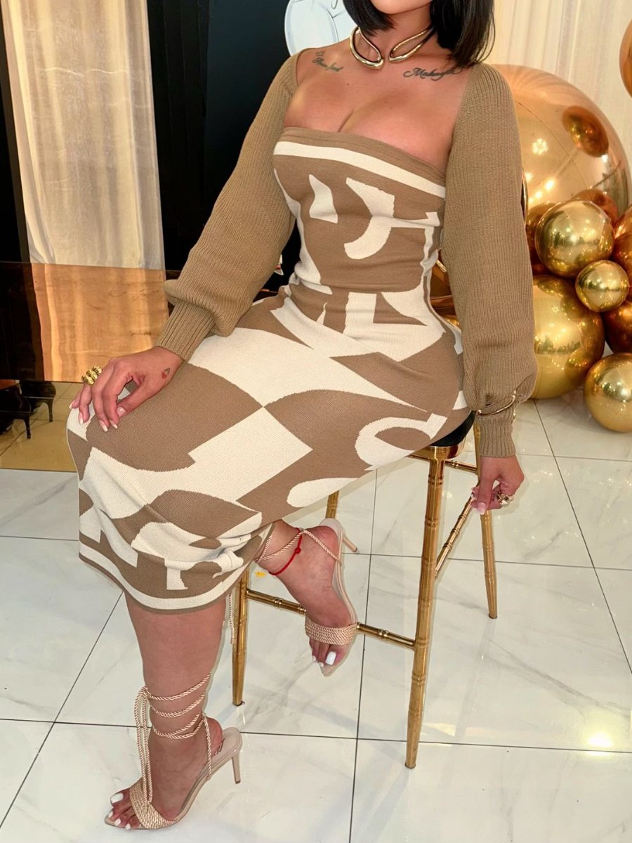 Printed Fungus Edge Long Sleeve Dress