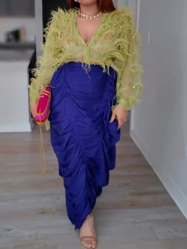 Feather-Trimmed Wrists Gemstone Embellishments Party Dress