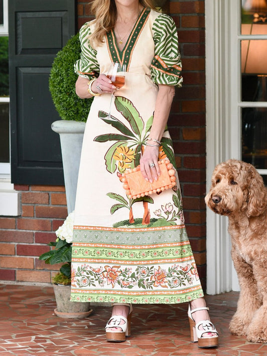 Printed Stand Collar Lantern Sleeve Single-breasted Belt Dress