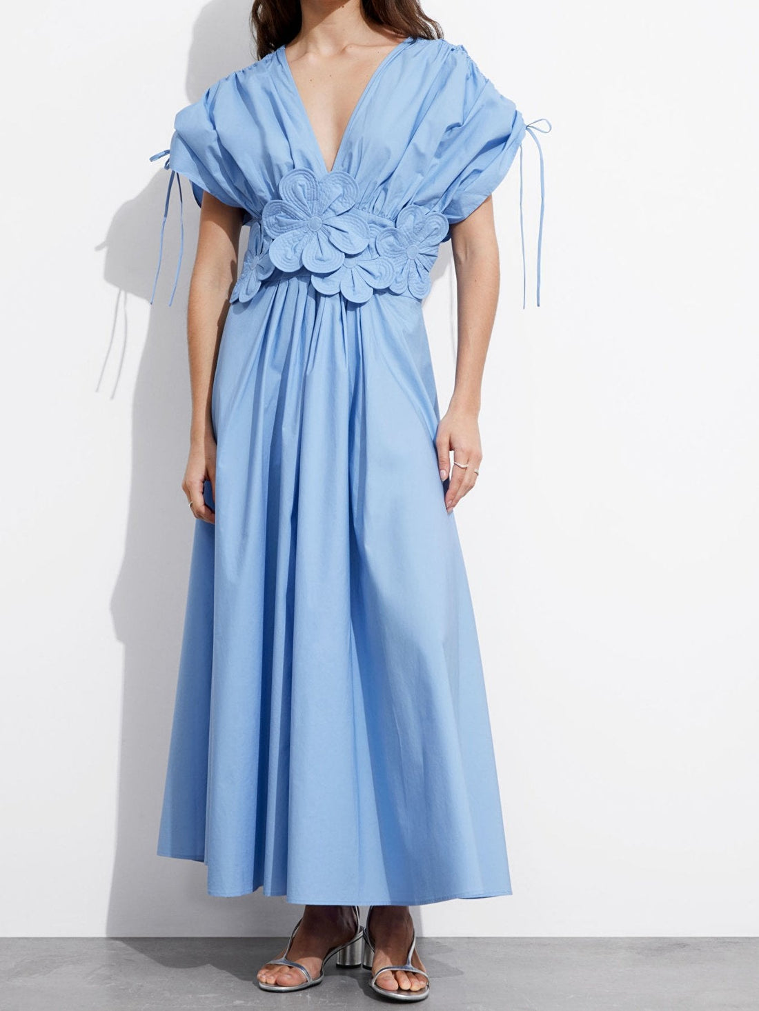 V Neck Ruffled Short Sleeve Belted Dress