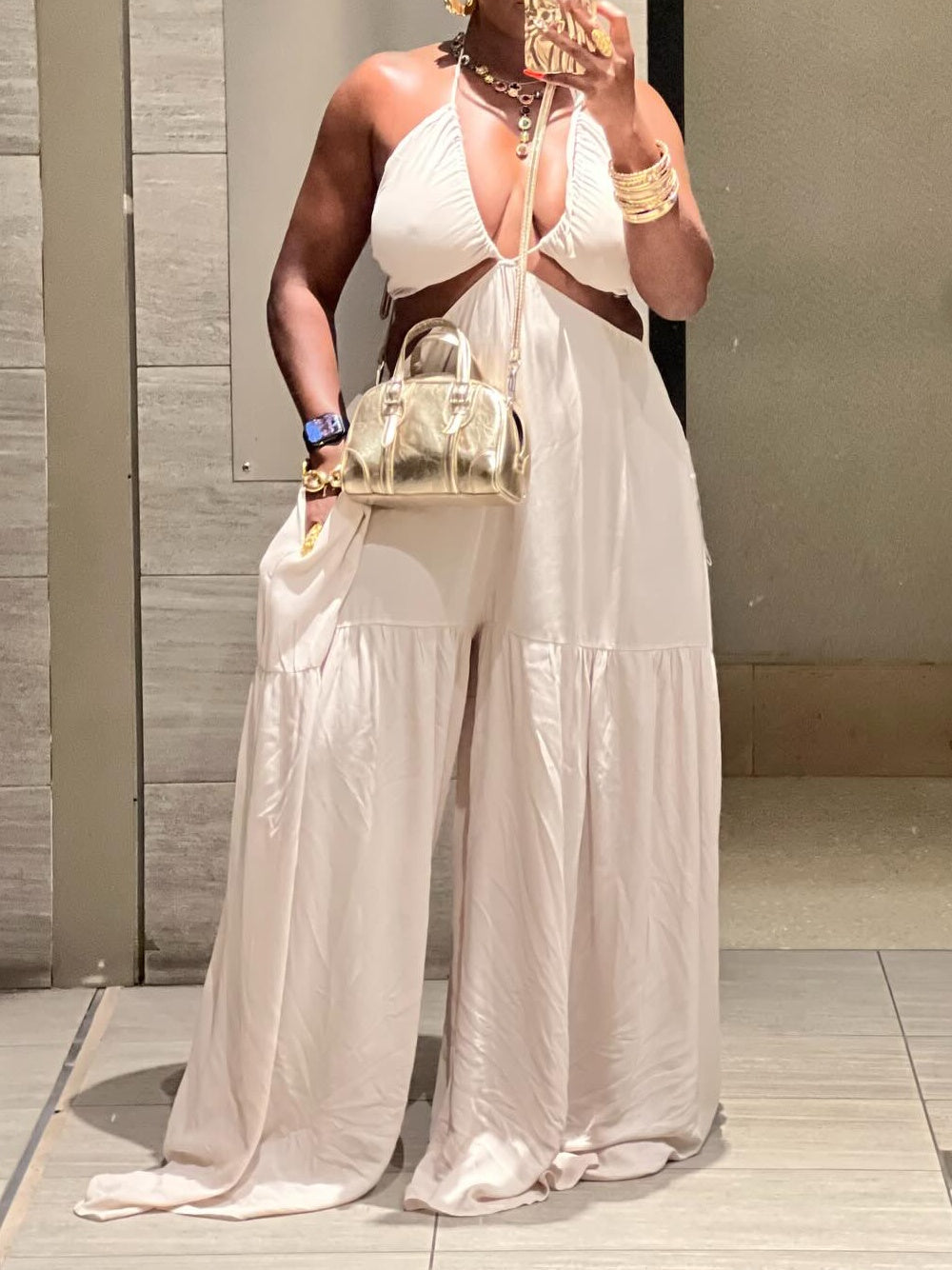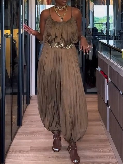 Strap Plunge Front Dropped Waist Ruched Wide Leg Jumpsuit
