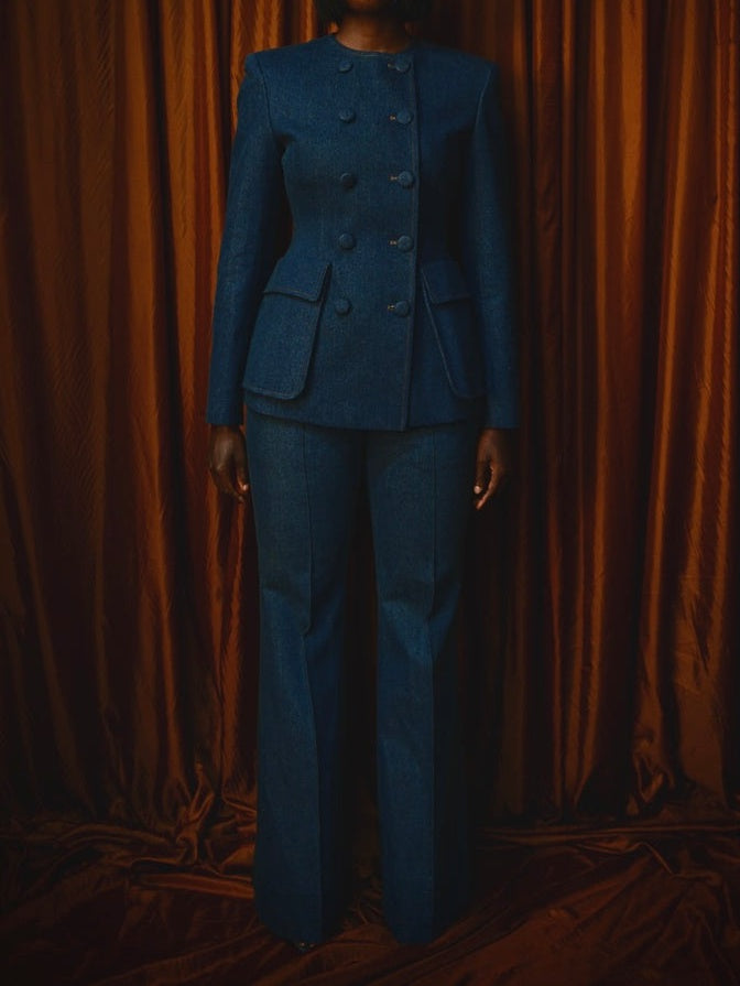 Double-Breasted Denim Suit Jacket + Denim Flared Pants Set