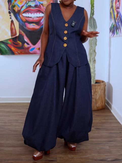 Casual Blue Pocket Pull-On Waist Denim Two Piece Pant Sets