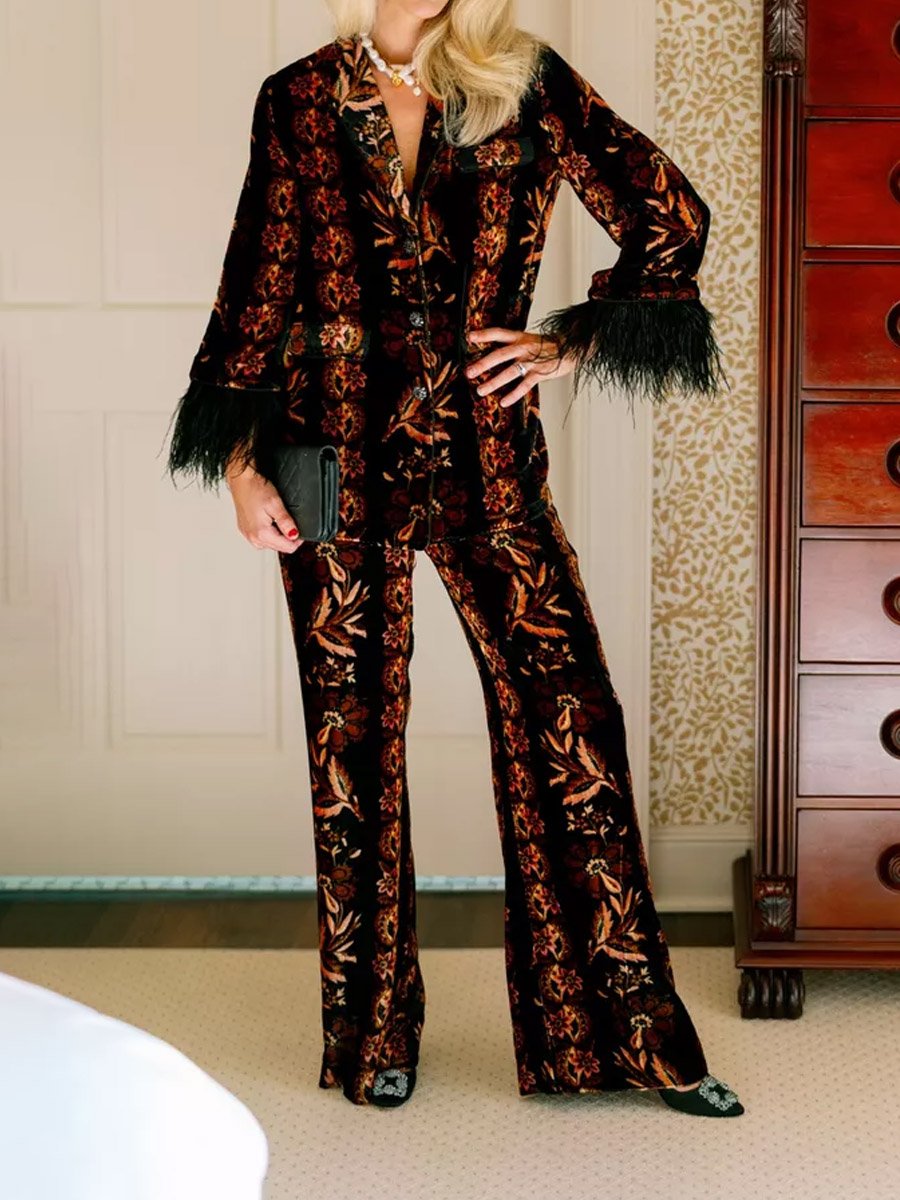 Vintage-Inspired Print Feathered Two Pieces Set