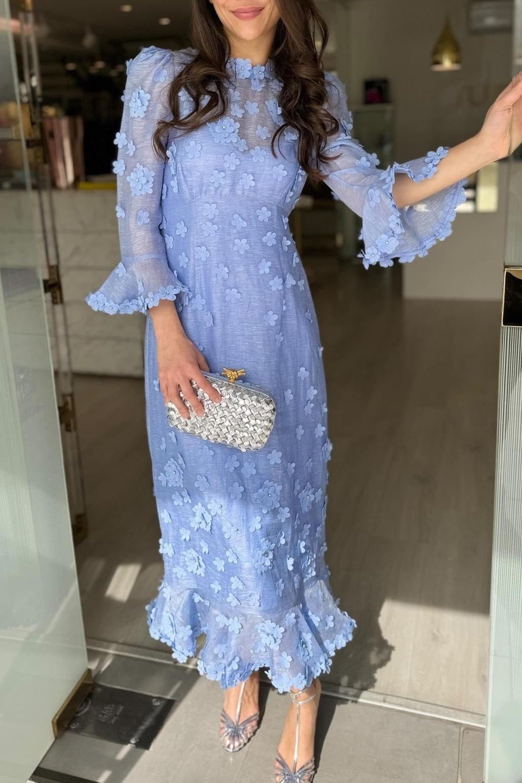 Glistening with crystal-embellished floral appliqués, it's made from crisp linen and silk-blend with prairie-inspired puffed shoulders and cropped ruffled sleeves. Complement the high collar with dainty earrings.