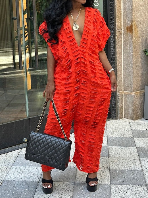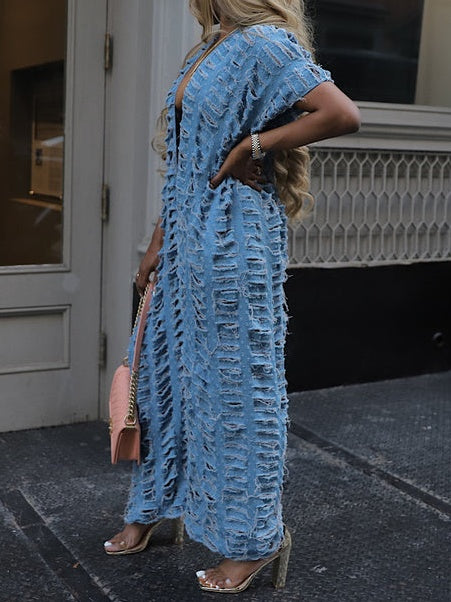 - This is your favorite denim dream cardigan turned into a gorgeous jumpsuit. It has a sexy deep plunge vneck design. It can be worn with a bathing suit underneath or a pop of color bralette.