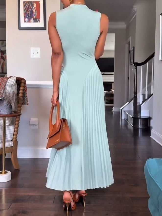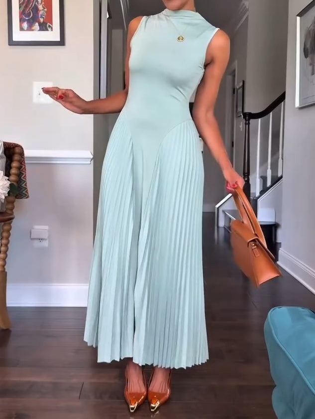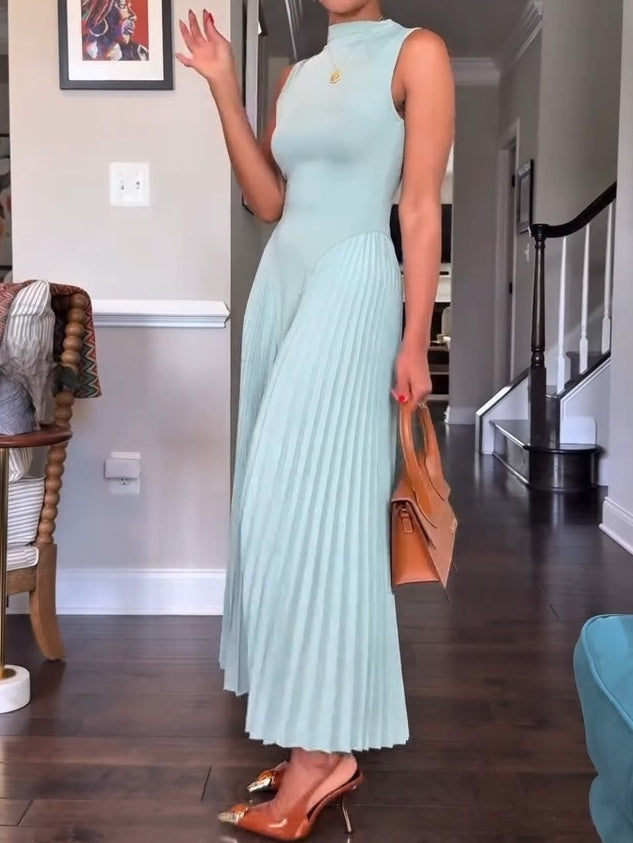 Details: Sleeveless, High Neck, Pleated, Midi, Maxi, Wrap Tie Neck