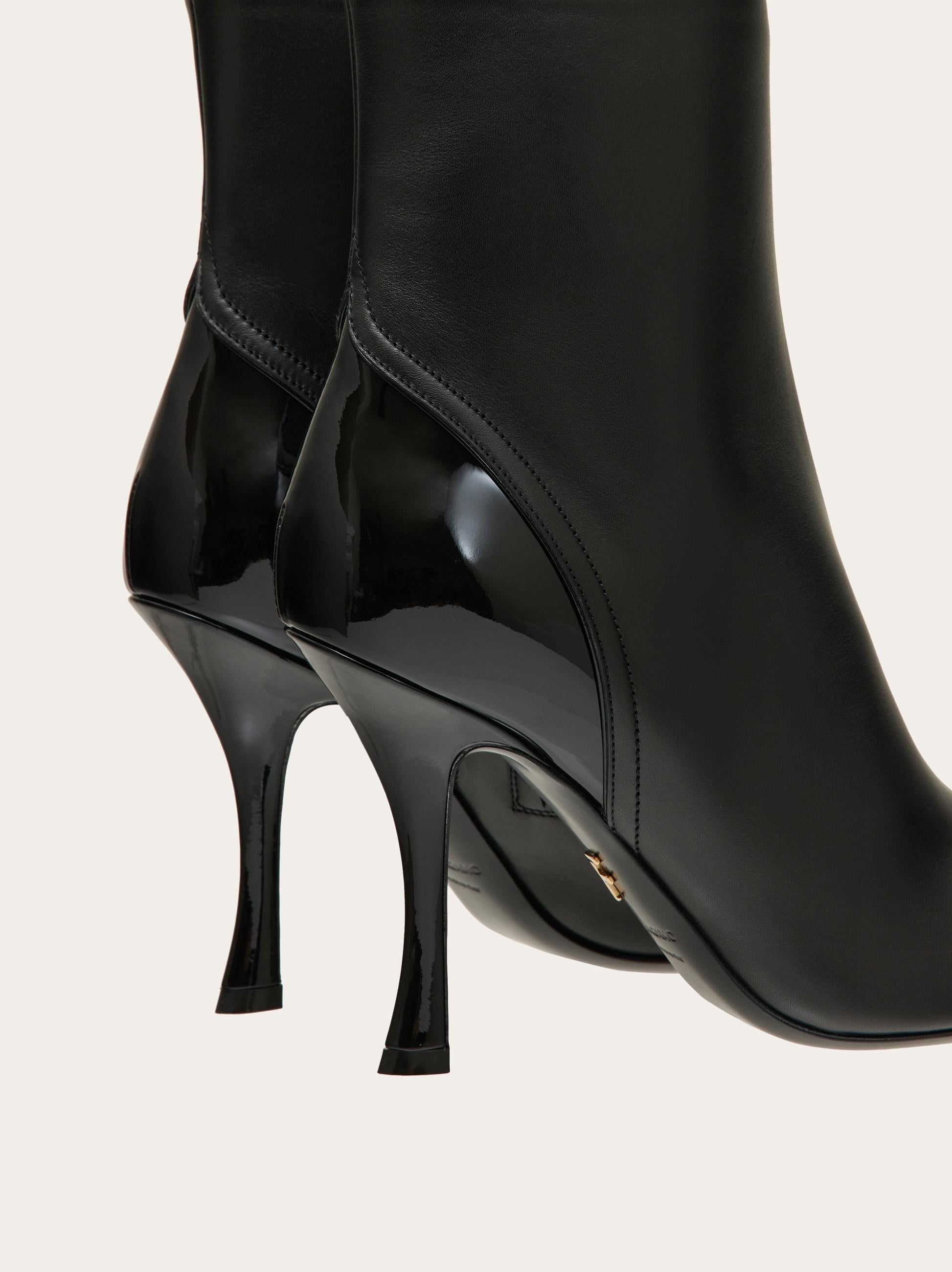 - It's all in the details. Contrasting textures peep through at the tip and heel of this sleek ankle boot in a zip-open effect that reveals the Ferragamo prowess in leather processing. The look is uptown sensual, echoed by the slim heel with a slight curve, while the zip inside the ankle ensures a glove-like fit.
