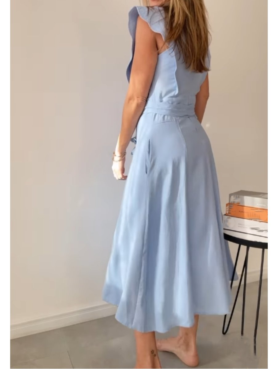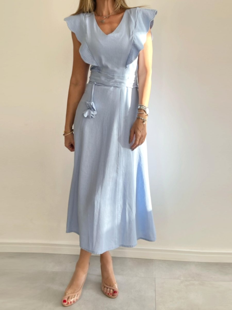Feminine cotton maxi dress with beautiful ruffle sleeves.