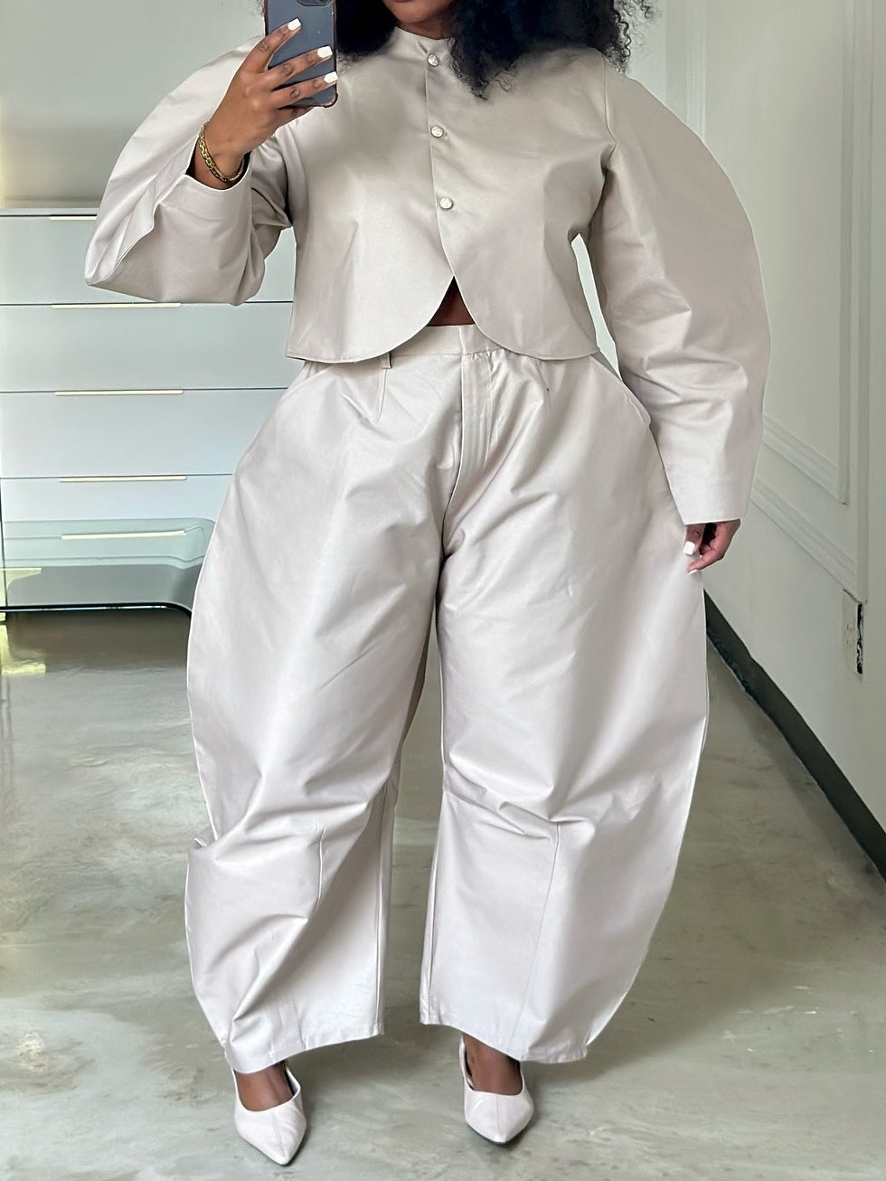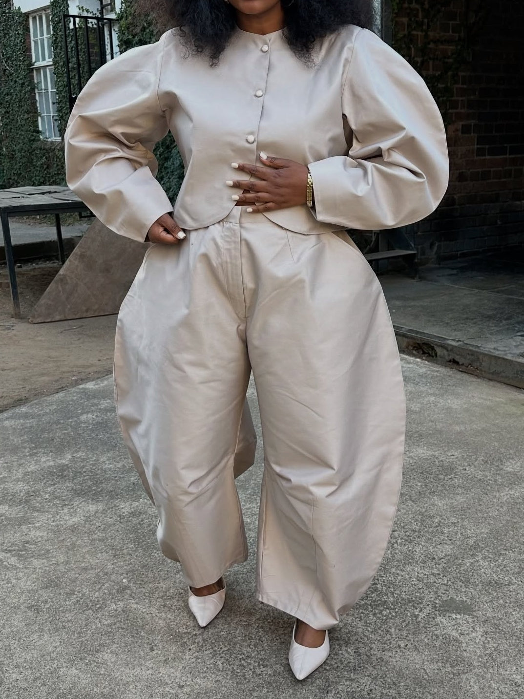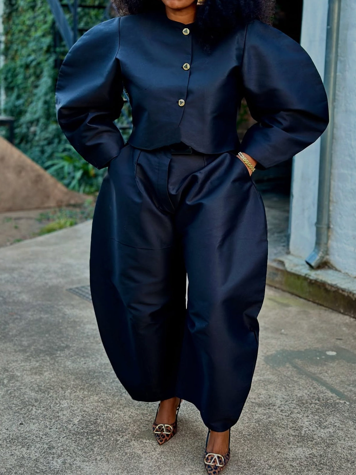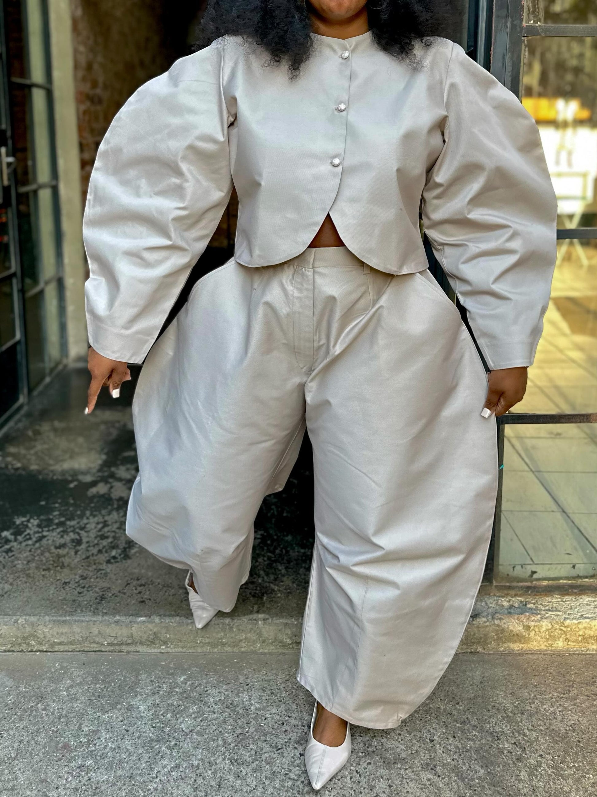 The Balloon Set, the epitome of contemporary sophistication! The luxurious Dupioni fabric drapes flawlessly, giving an aura of refined glamour. The bold shoulders make a powerful statement, while the jogger-esque pant design adds a dash of urban chic. Transition seamlessly from day to night with this versatile ensemble.