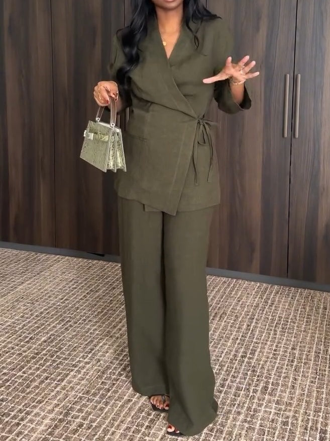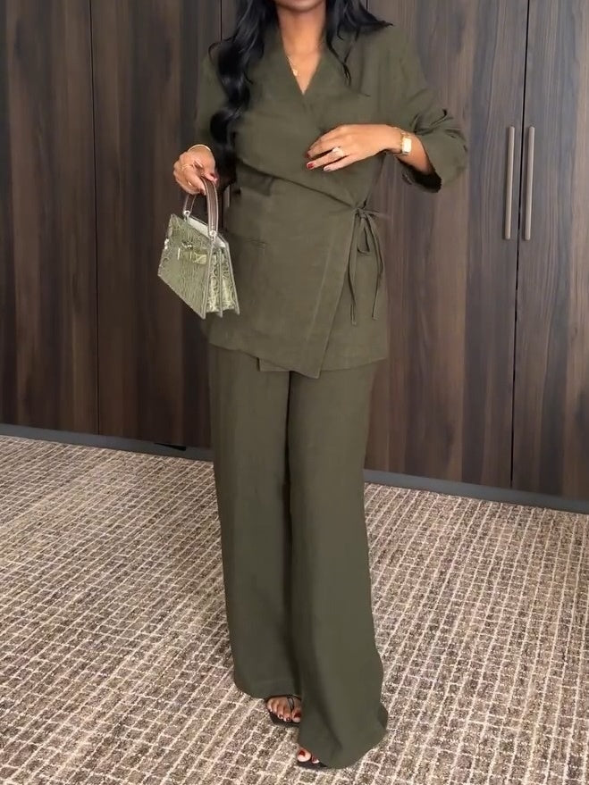Wrap-style fastening with ties.
