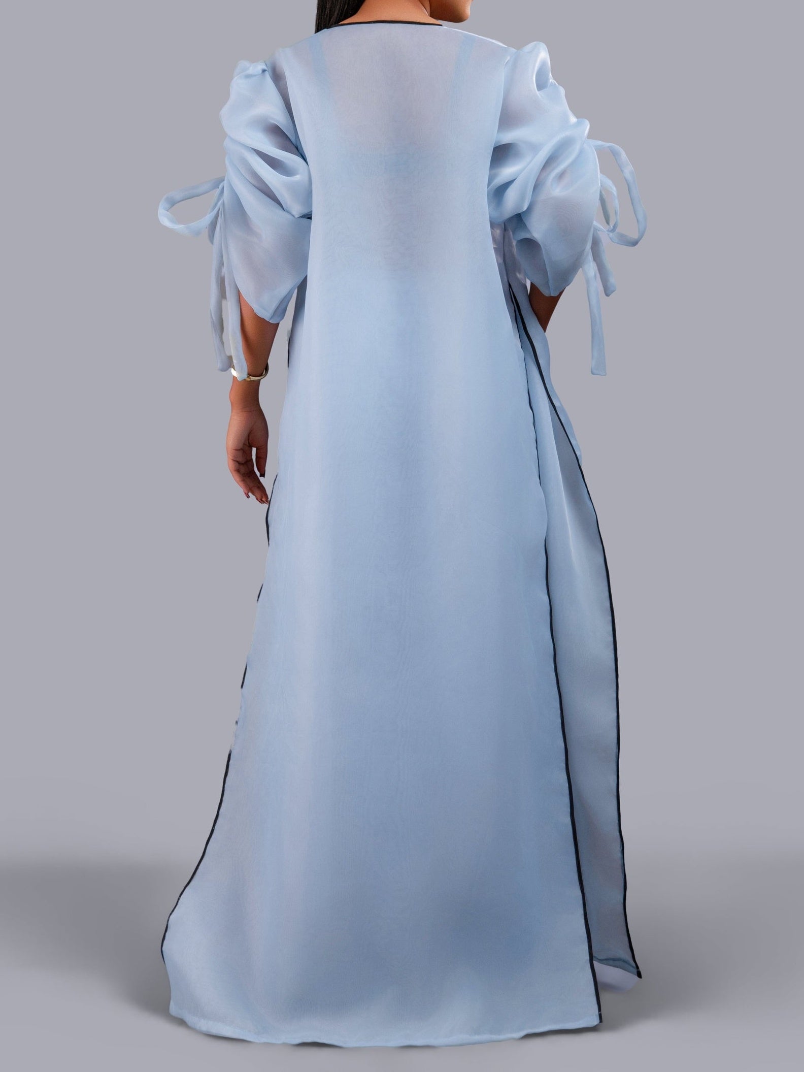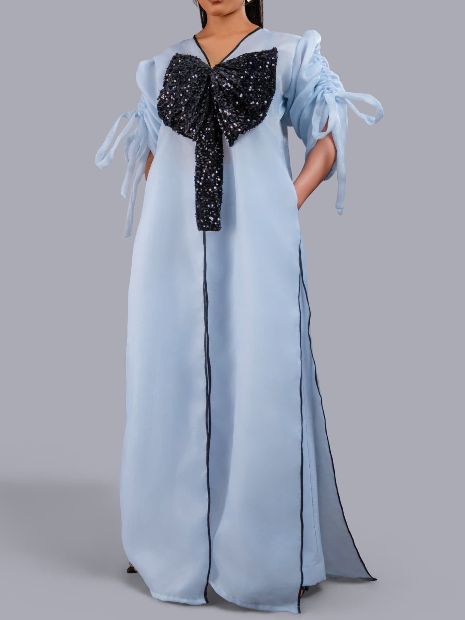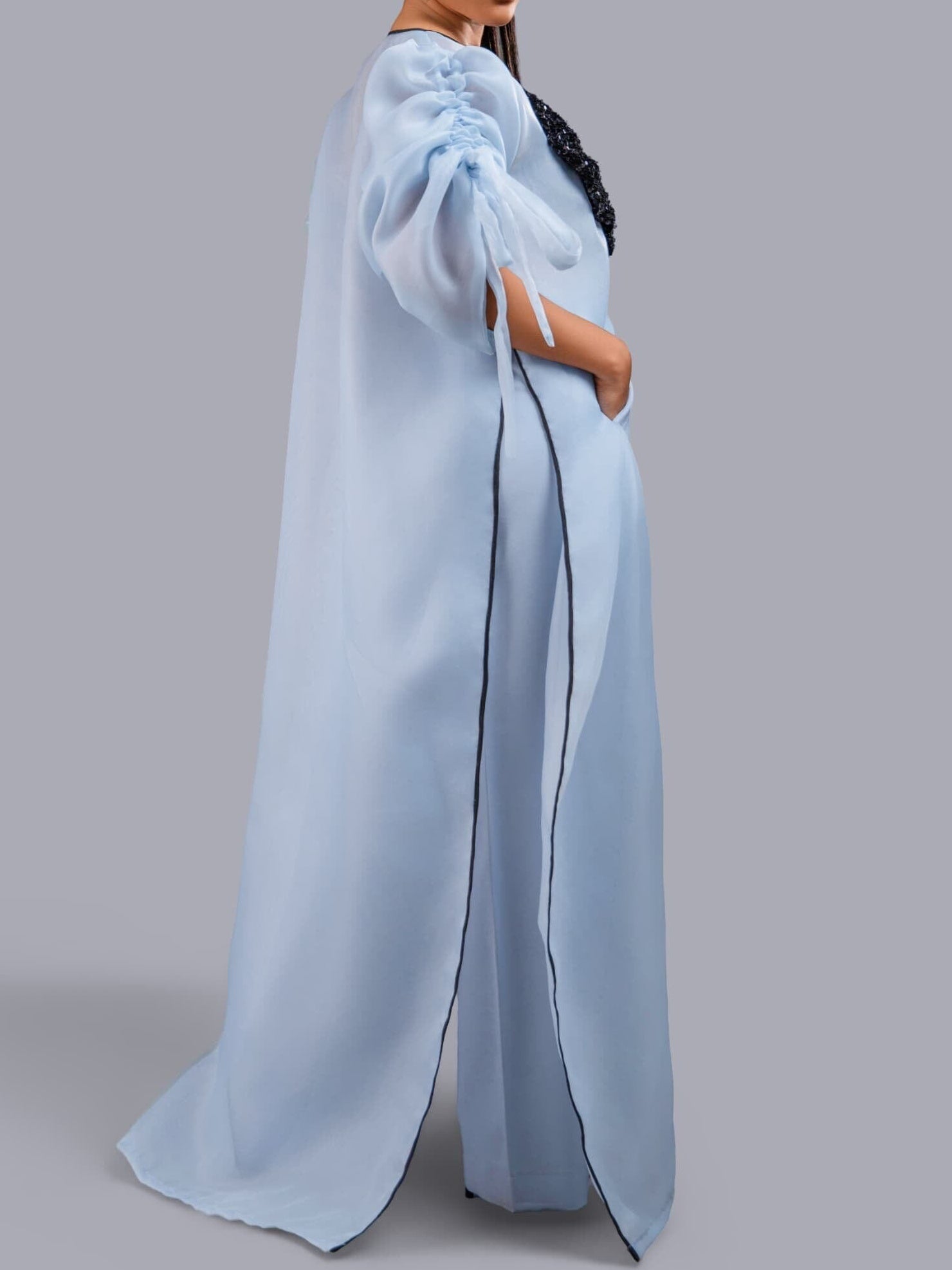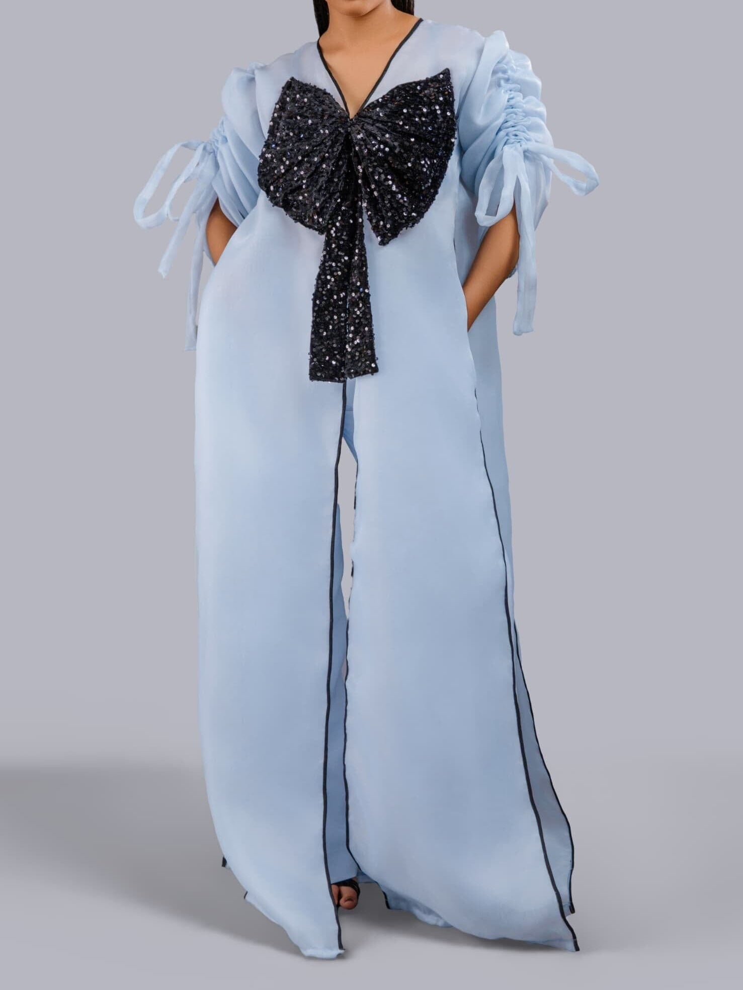 Tops: Organdy fabric with black cut-out sequin detailing and rope sleeves for adjustable fit