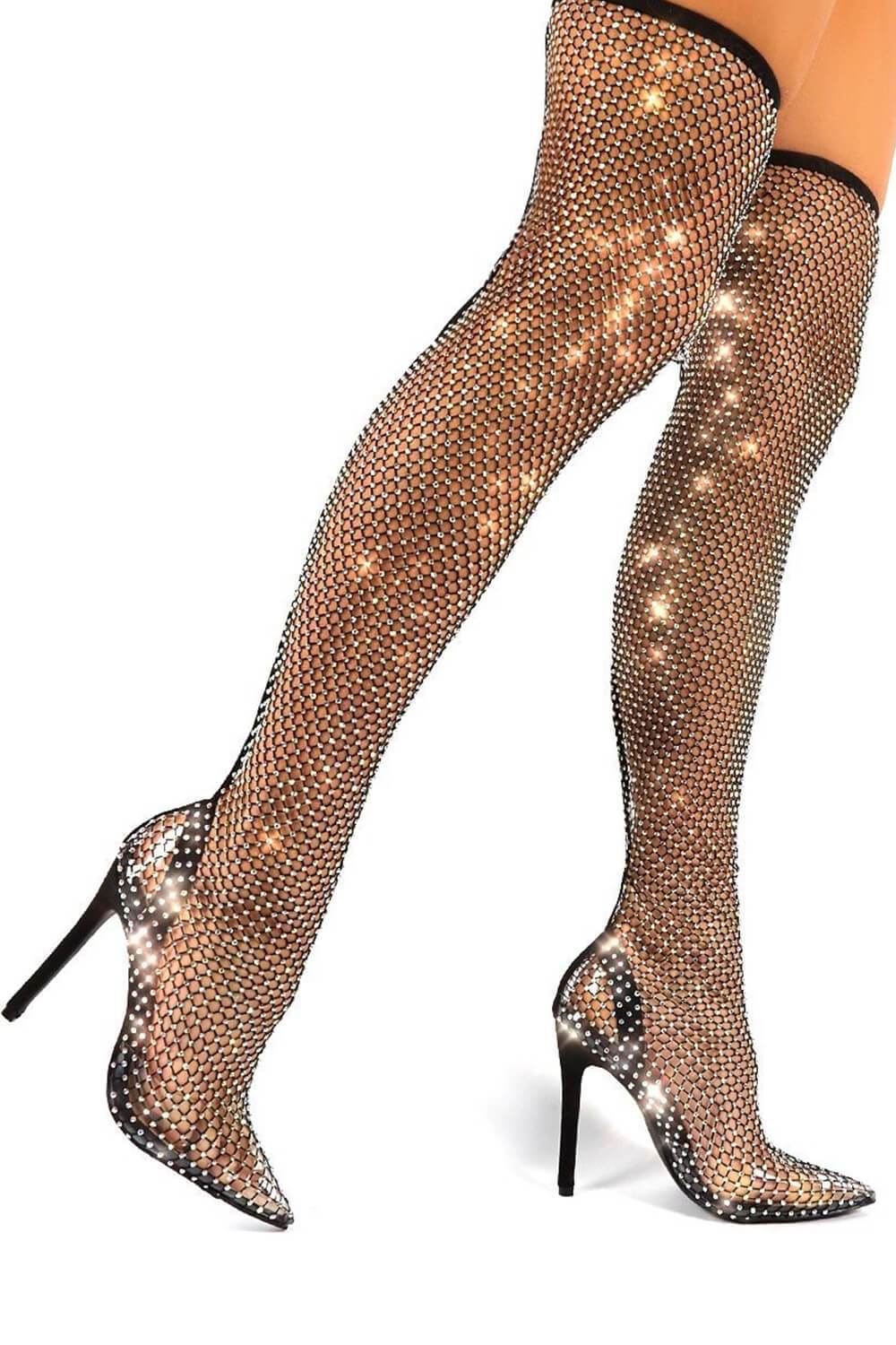 Black Diamante Fishnet Over The Knee Thigh High Long Sock Boots