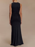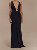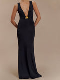 - Featuring a deep V neckline and a sleeveless silhouette, this bodycon dress accentuates your curves while exuding confidence and sophistication. The fully lined design ensures comfort and a smooth fit, while the stunning fishtail hem shape adds an element of drama with every step. The maxi length creates an elegant flow, perfect for any occasion, from upscale events to intimate gatherings. Adorned with exquisite floral hardware at the centre front, this dress merges chic style with captivating details.