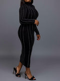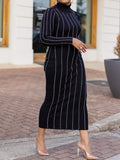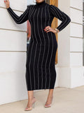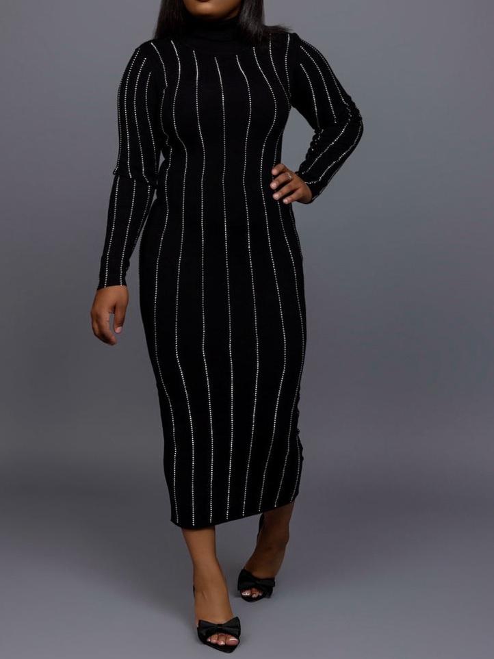 Step out in style with this sleek black turtleneck midi dress, designed for the woman who loves a chic, understated look with a hint of edge. Featuring shimmering rhinestone pinstripes that elongate the figure, this dress offers a sophisticated silhouette that hugs your curves in all the right places. The turtleneck design adds a polished touch, while the fitted long sleeves keep the look elegant and versatile.