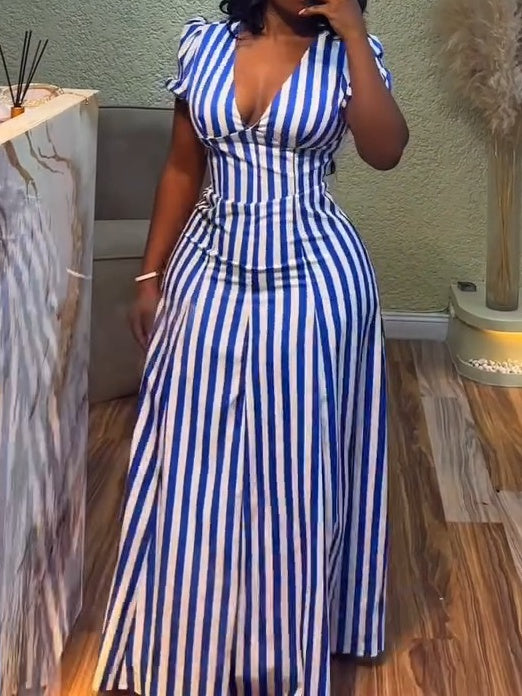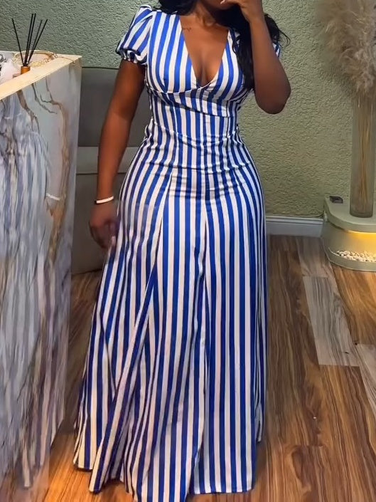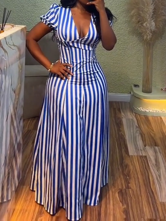 Blue Elegant Striped V Neck Puff Sleeve Maxi Dress