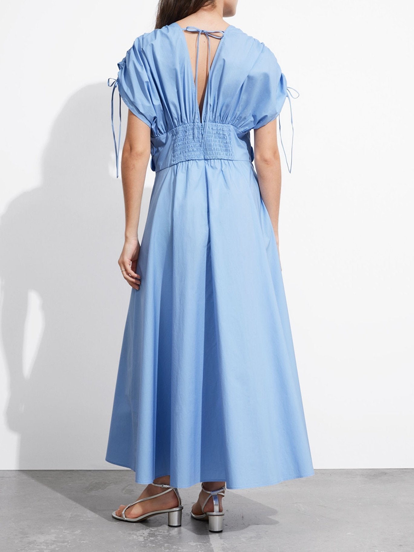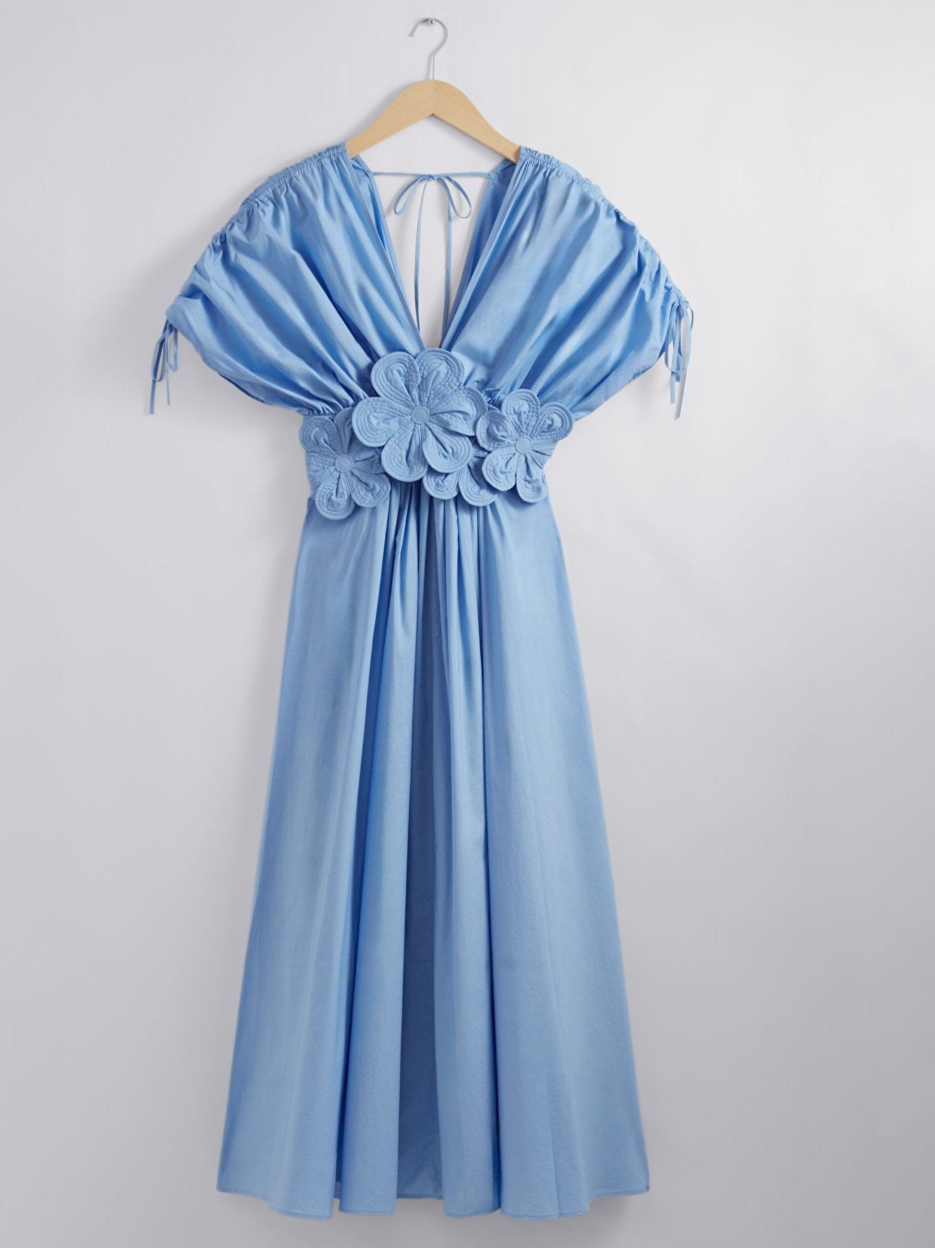 Maxi dress featuring a gently pleated silhouette and an elasticated waistline detailed with floral appliqués.