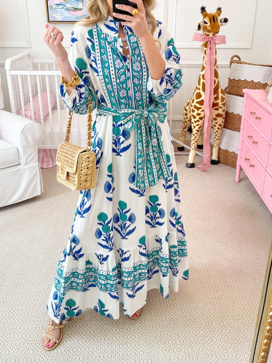 Regular fit, V-neckline, long sleeves, shirred trims at shoulders and sleeve hems, elasticated waistband, floral pattern, tiered flared hem