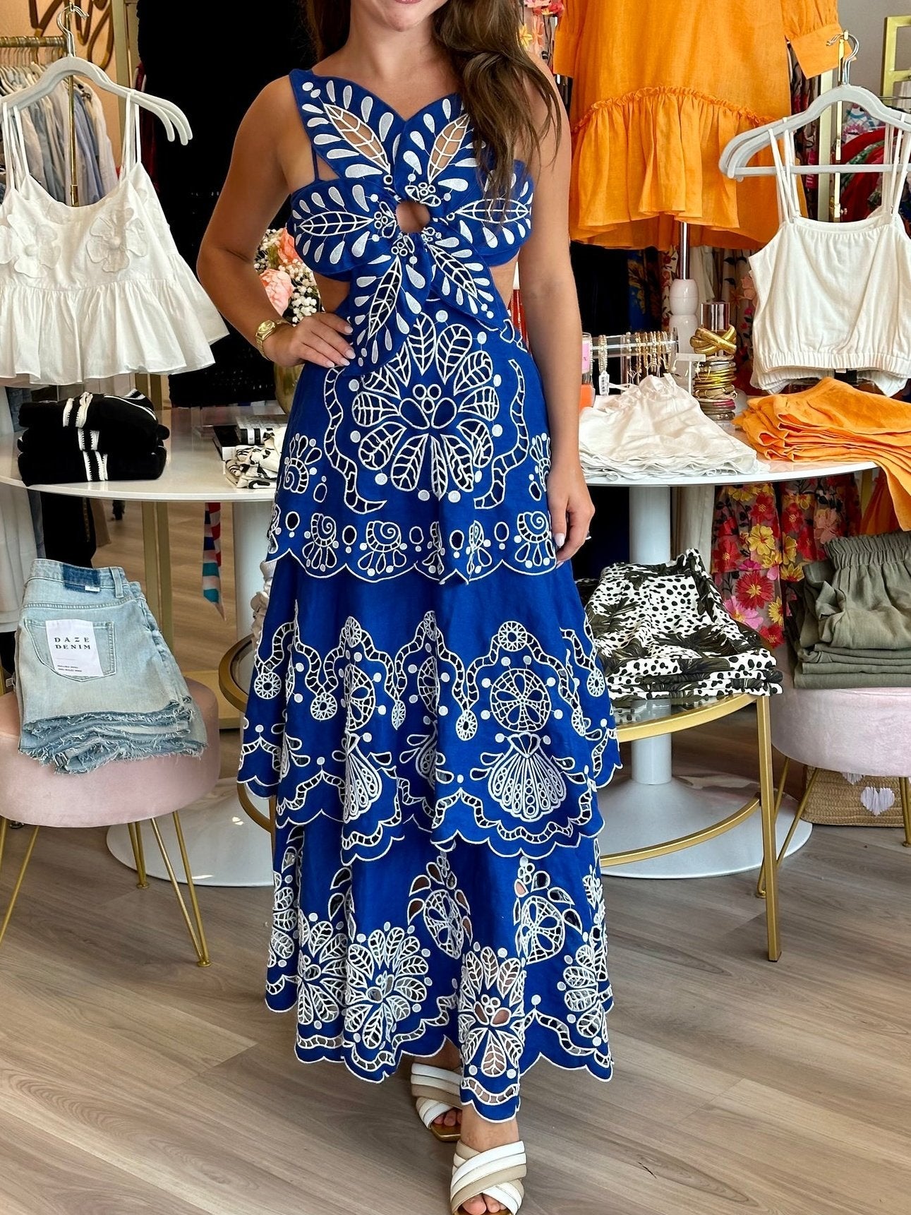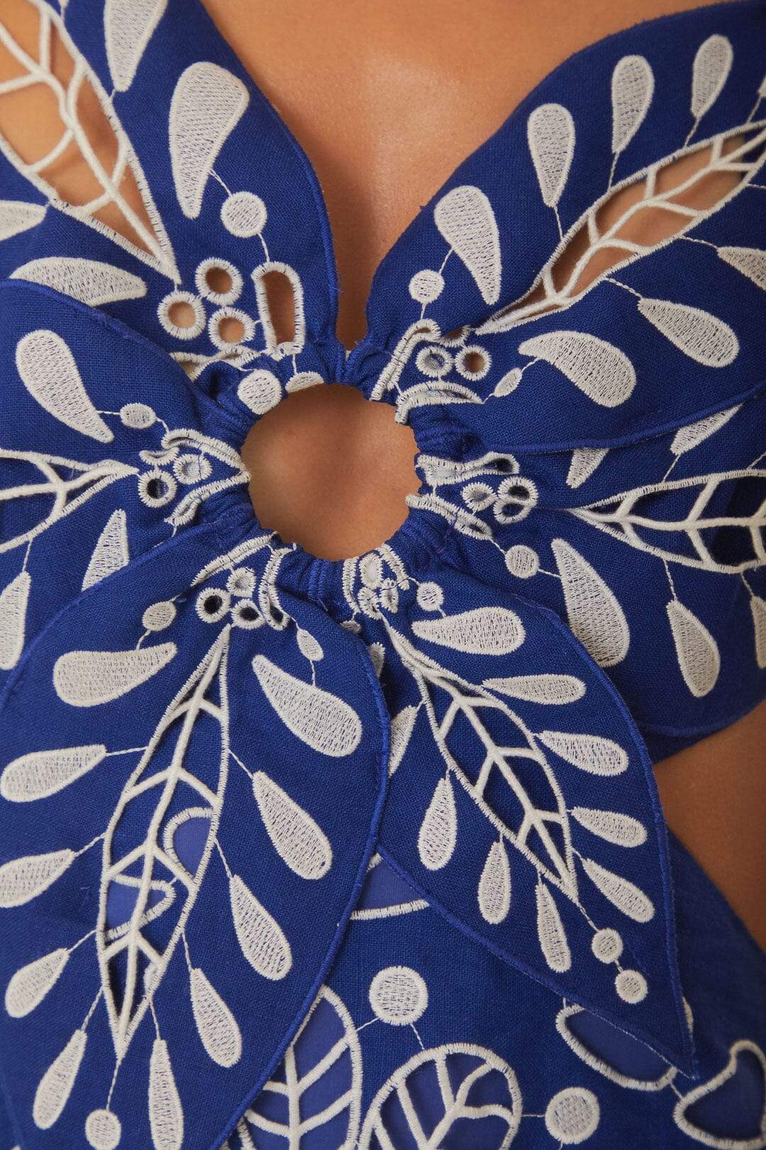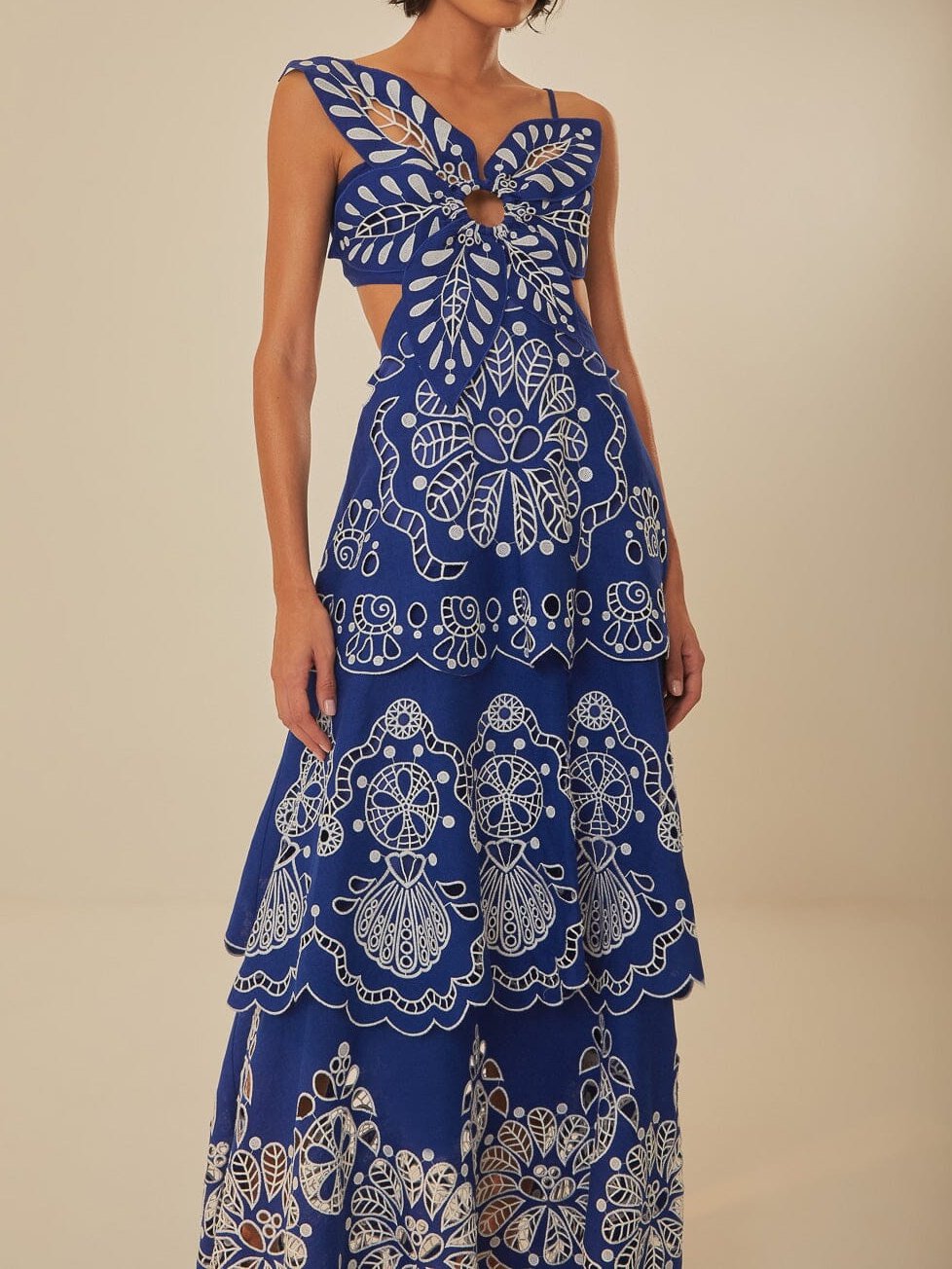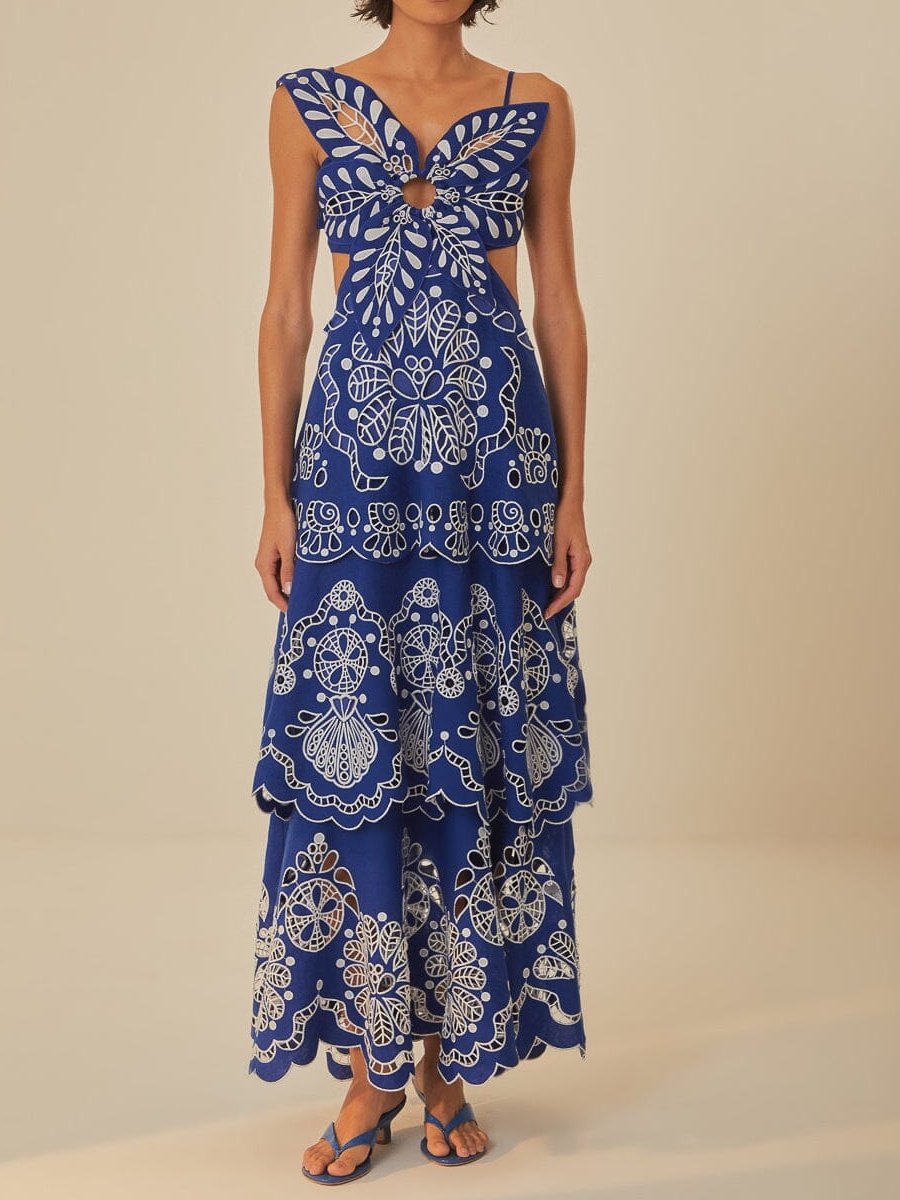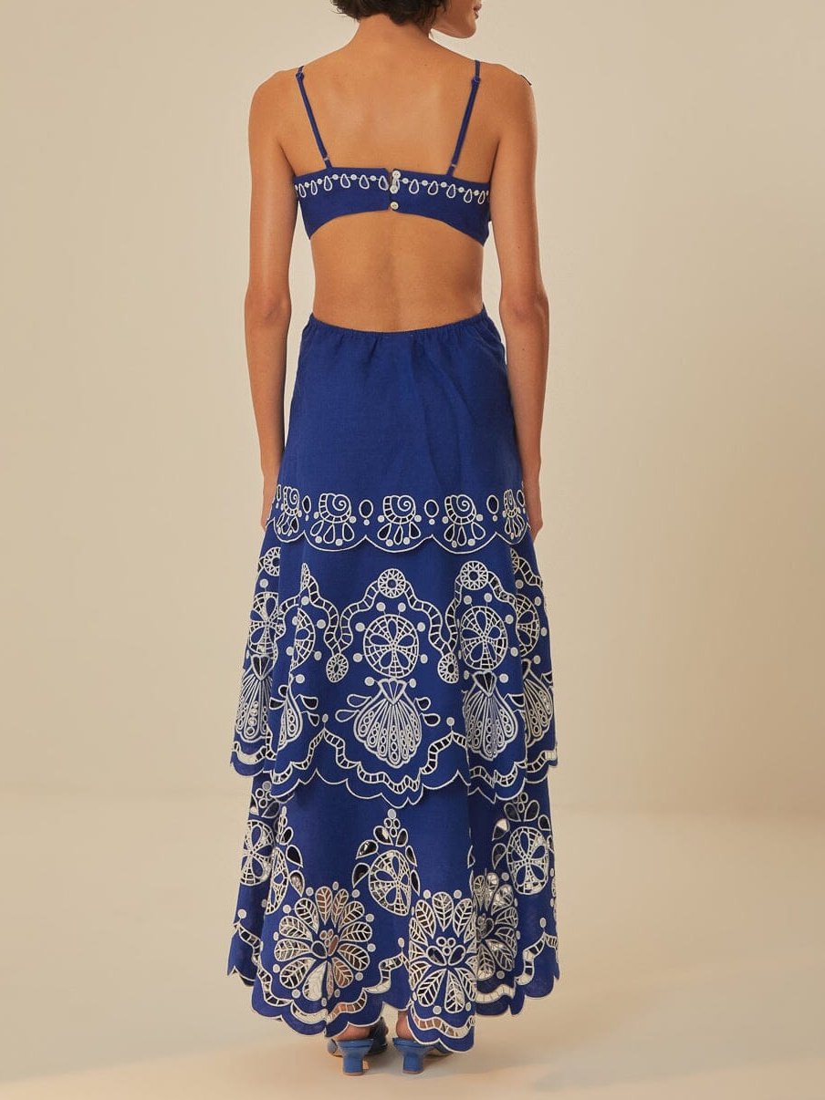 asymmetrical neckline that adds a touch of uniqueness. Adorned with intricate white Richelieu embroidery on a deep blue linen canvas, this dress exudes a relaxed yet sophisticated vibe. The cutting-edge design, accented with playful cutouts and a graceful, flowing silhouette, is crafted from premium eco-conscious linen, perfect for your warm-weather wardrobe.