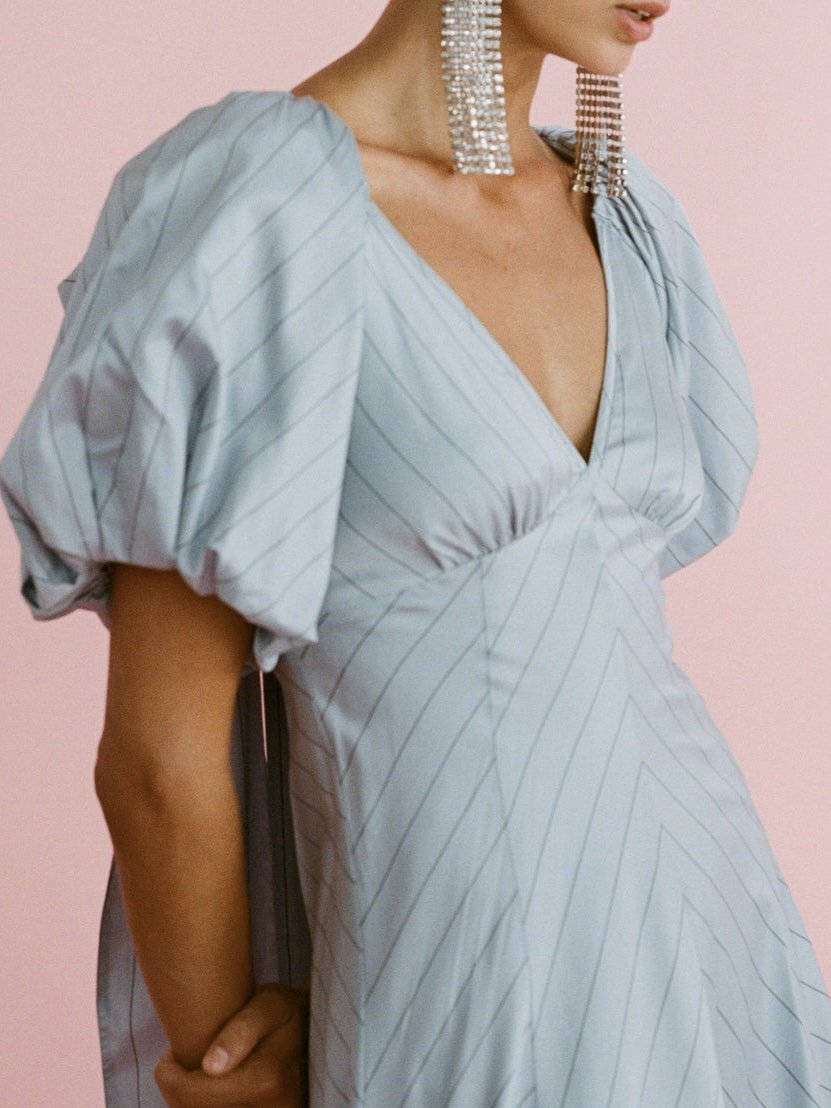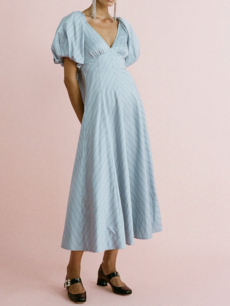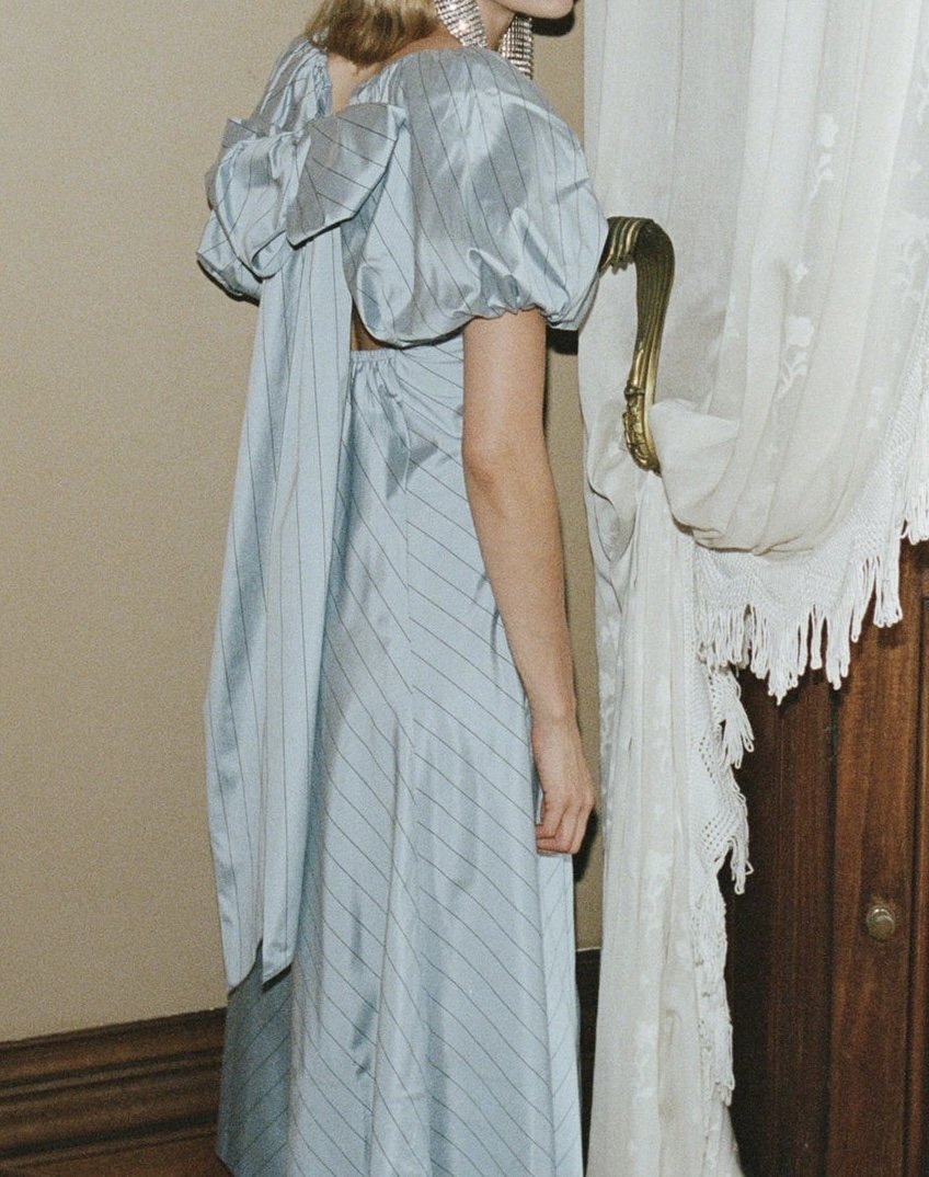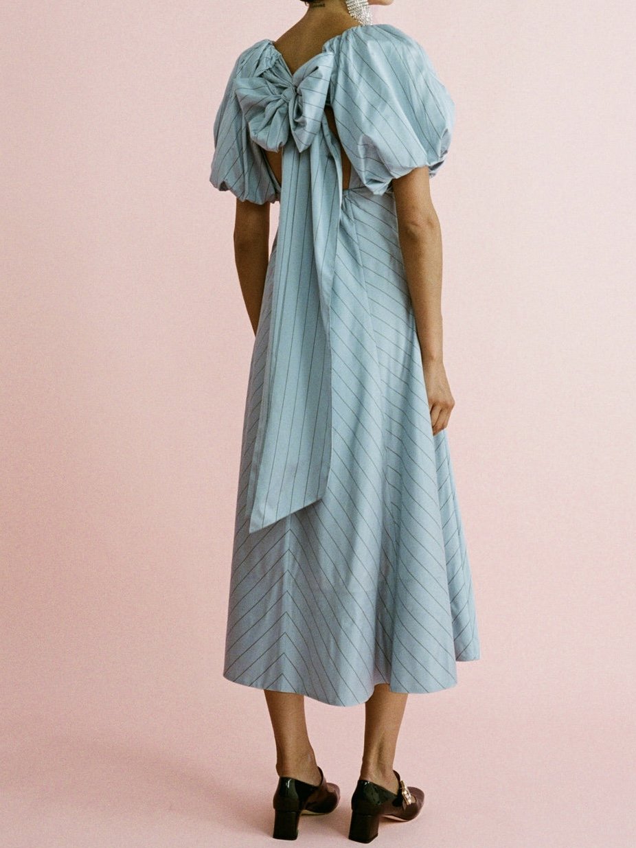Made from linen blend, the Maxi dress in blueberry stripe is a flattering day-to-evening style featuring pockets, a back neck ribbon tie, and delicate binding details. Pair with big earrings and contrasting shoes for a statement.
