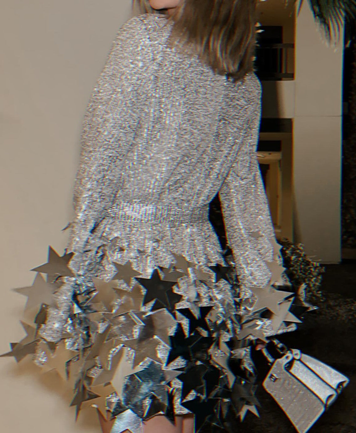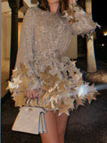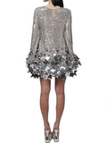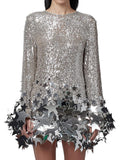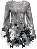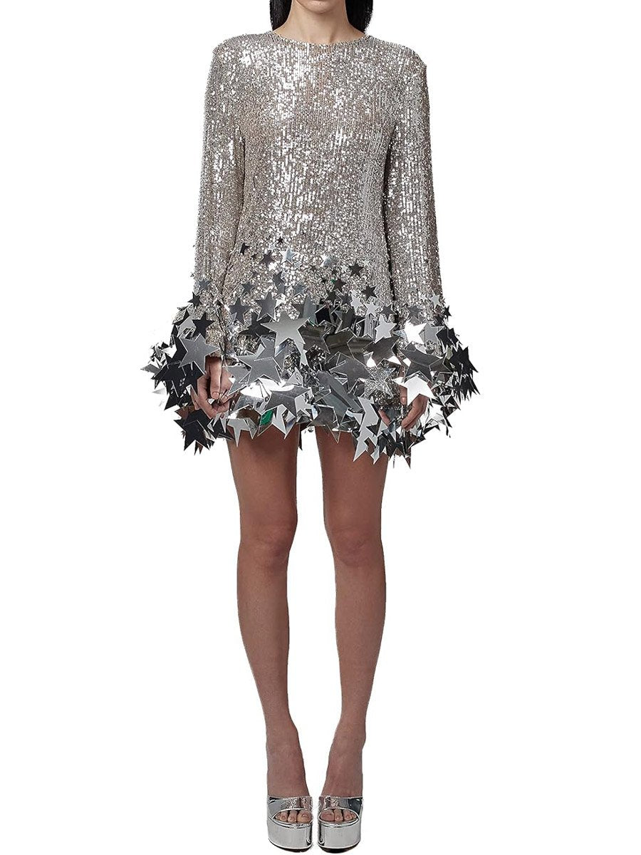 Long sleeve sequin shift dress with cascading silver star shaped paillettes.