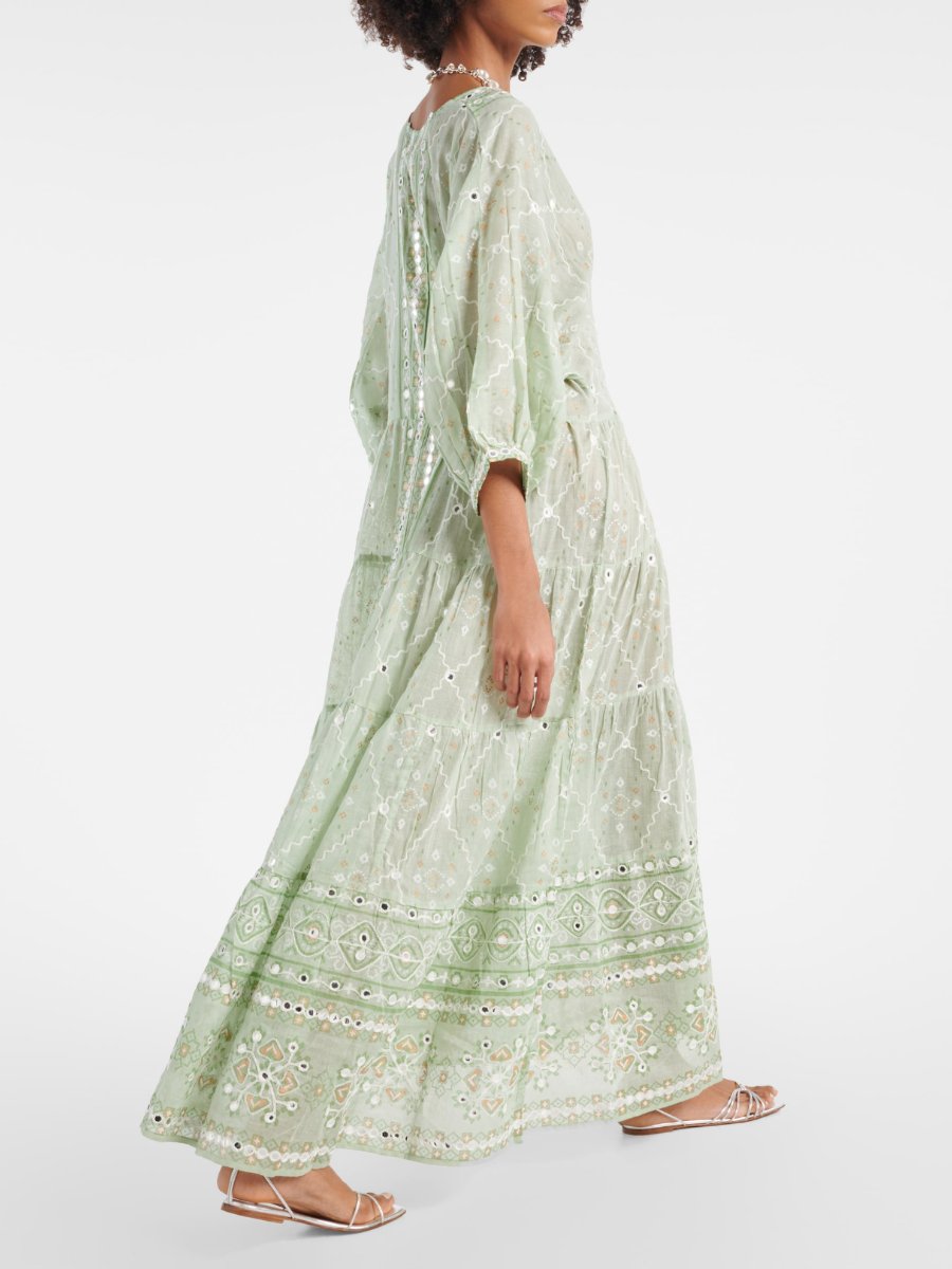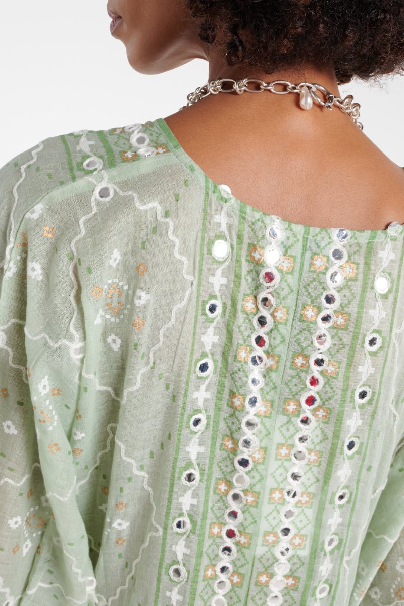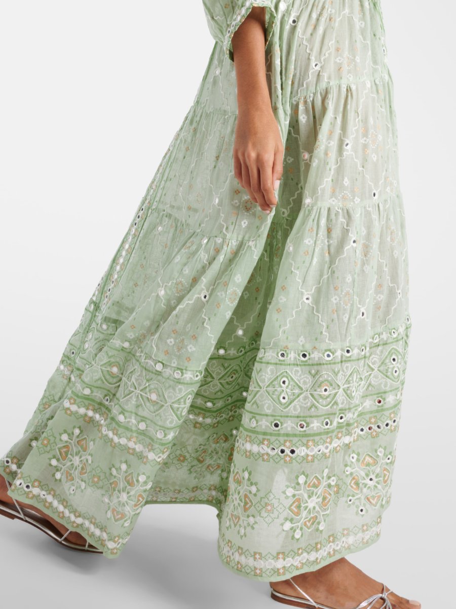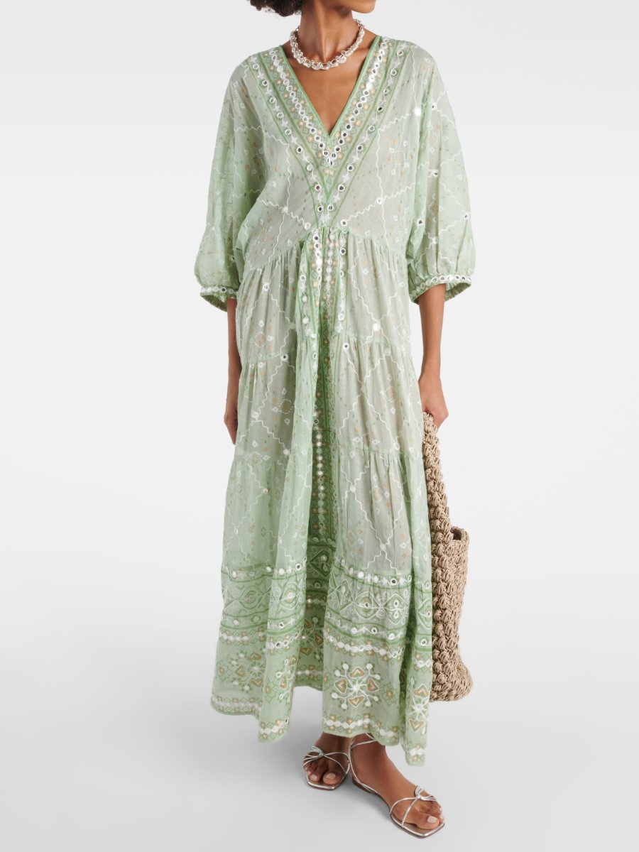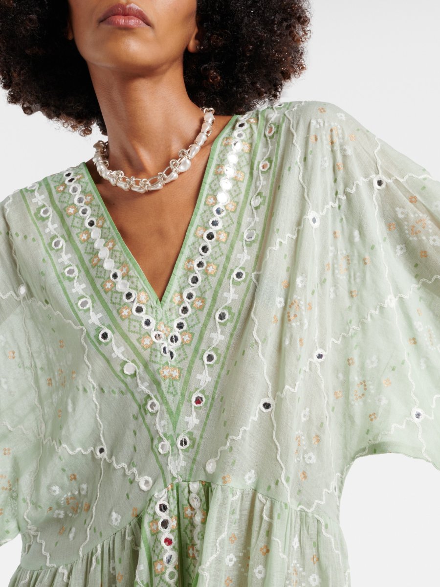 Design: Intricate green embroidery with floral patterns, V-neckline, and puff sleeves.