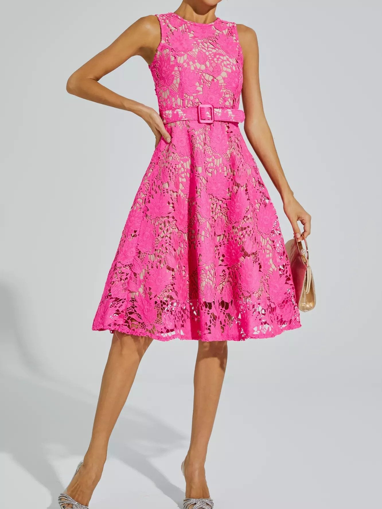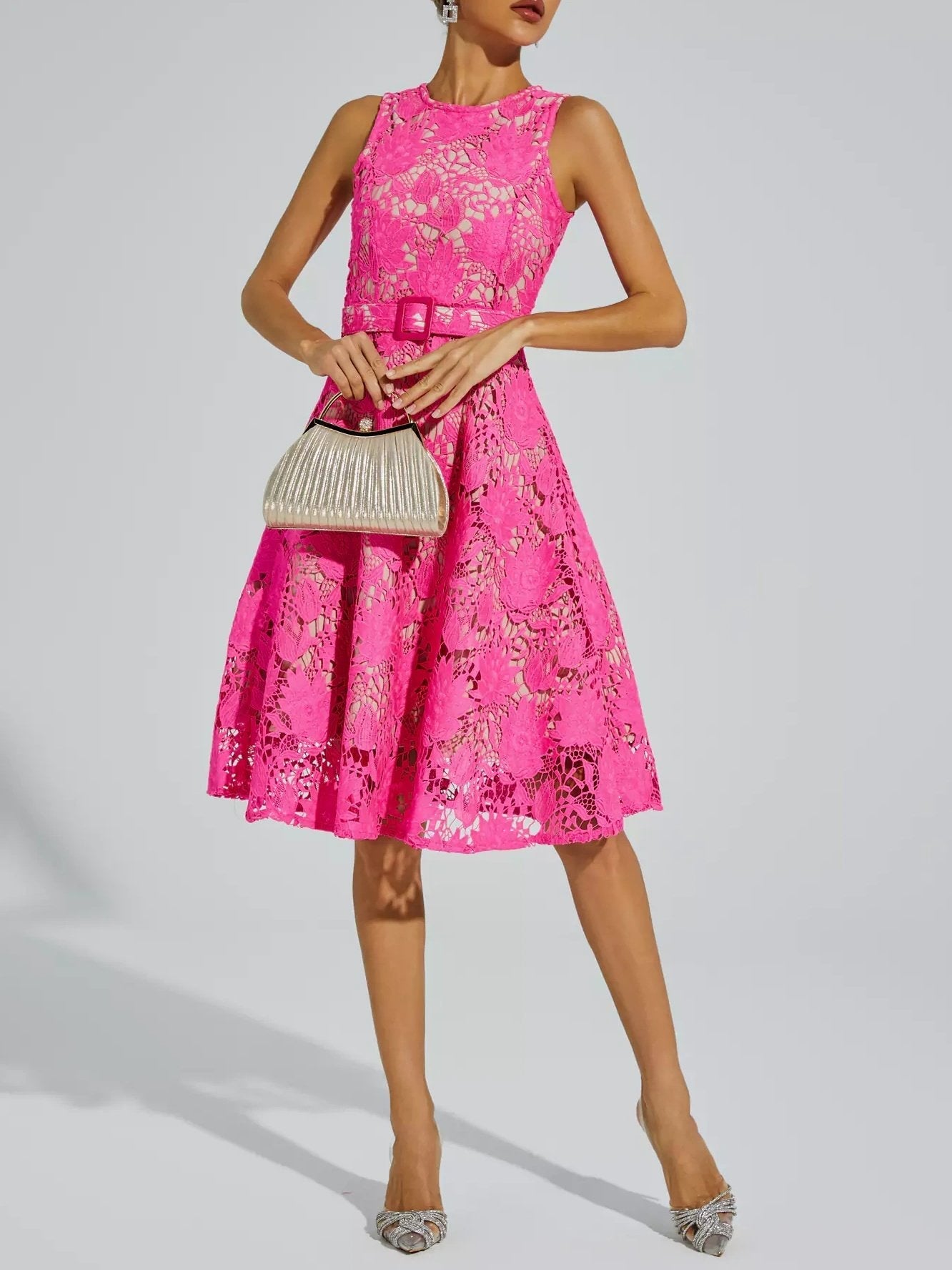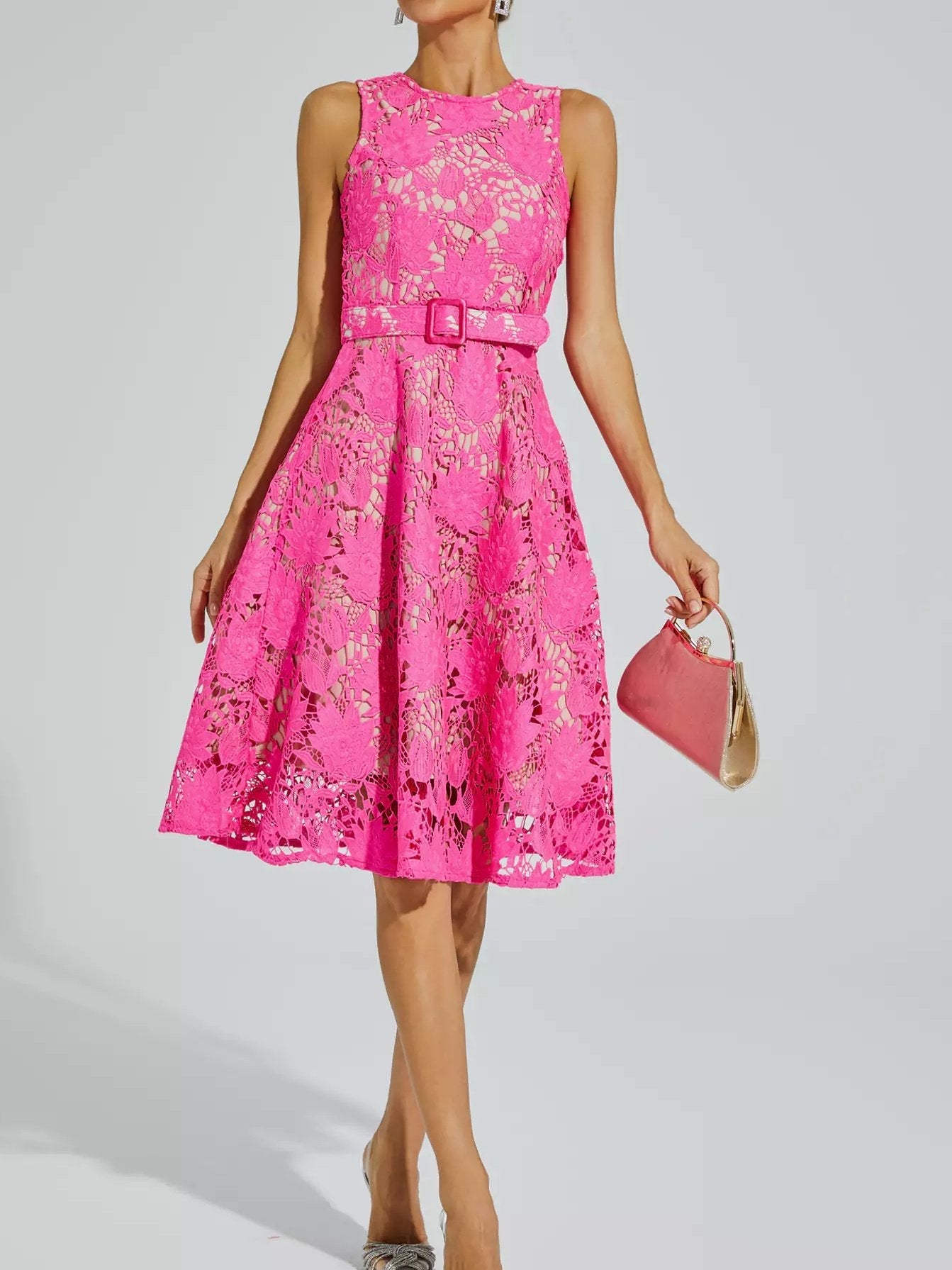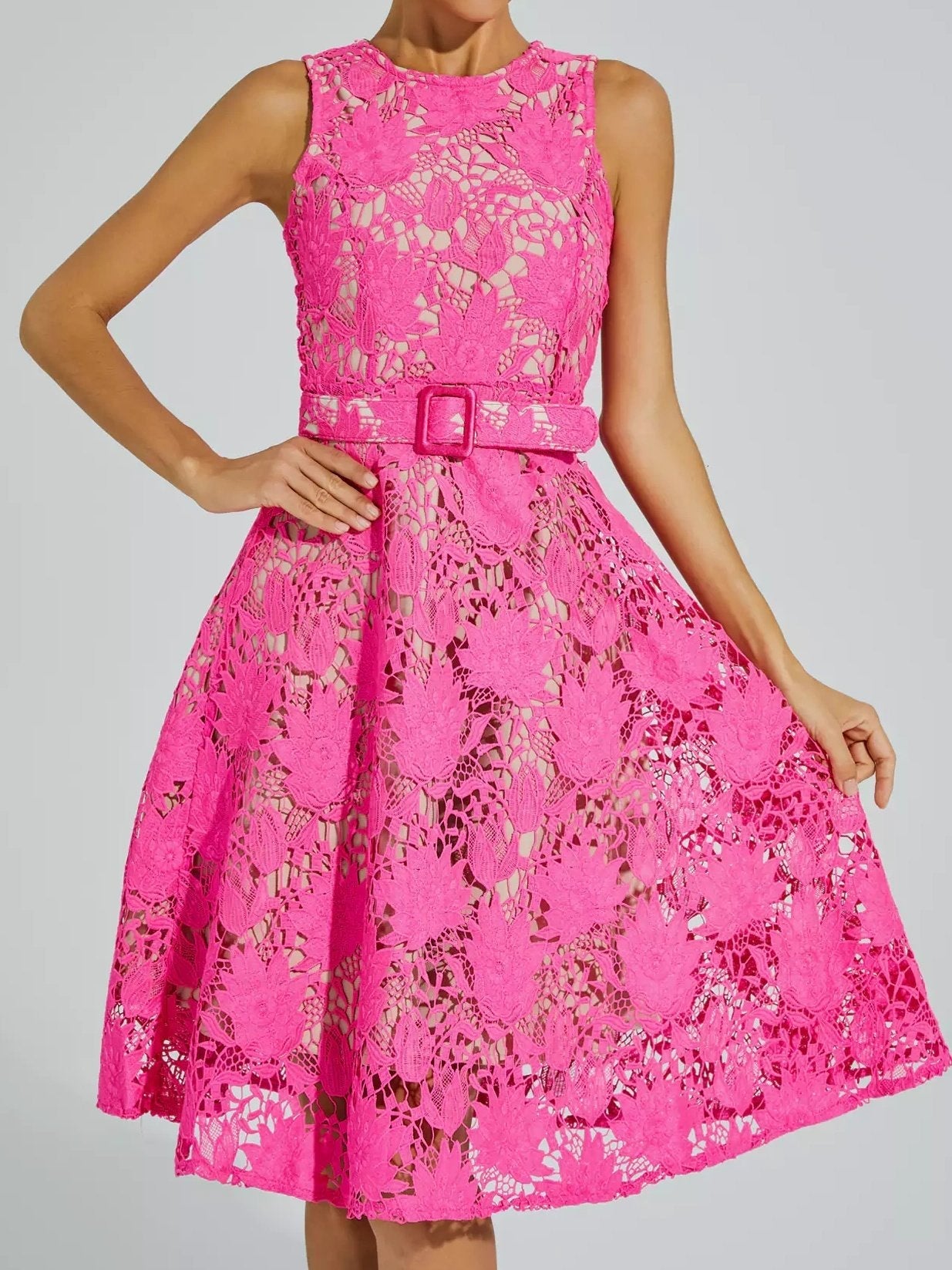 Elevate your style with the exquisite Brian Rose Red Lace Belted Midi Dress. Crafted from high-quality lace, this sleeveless dress showcases a vibrant rose red hue that exudes elegance. Its belted design accentuates your waist, while the midi length adds a touch of sophistication. A must-have for any fashion-forward woman.