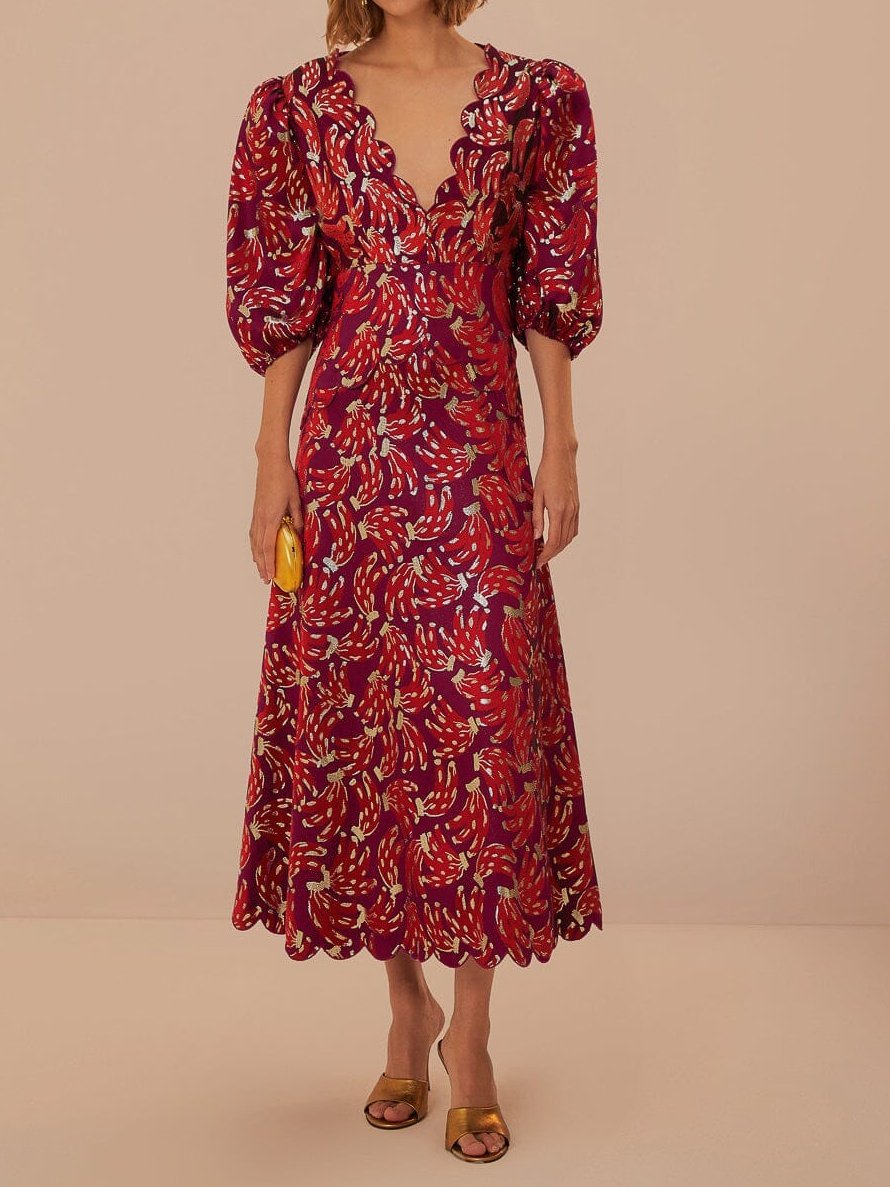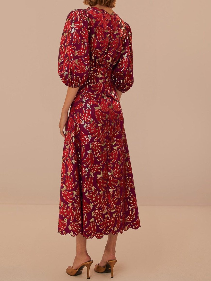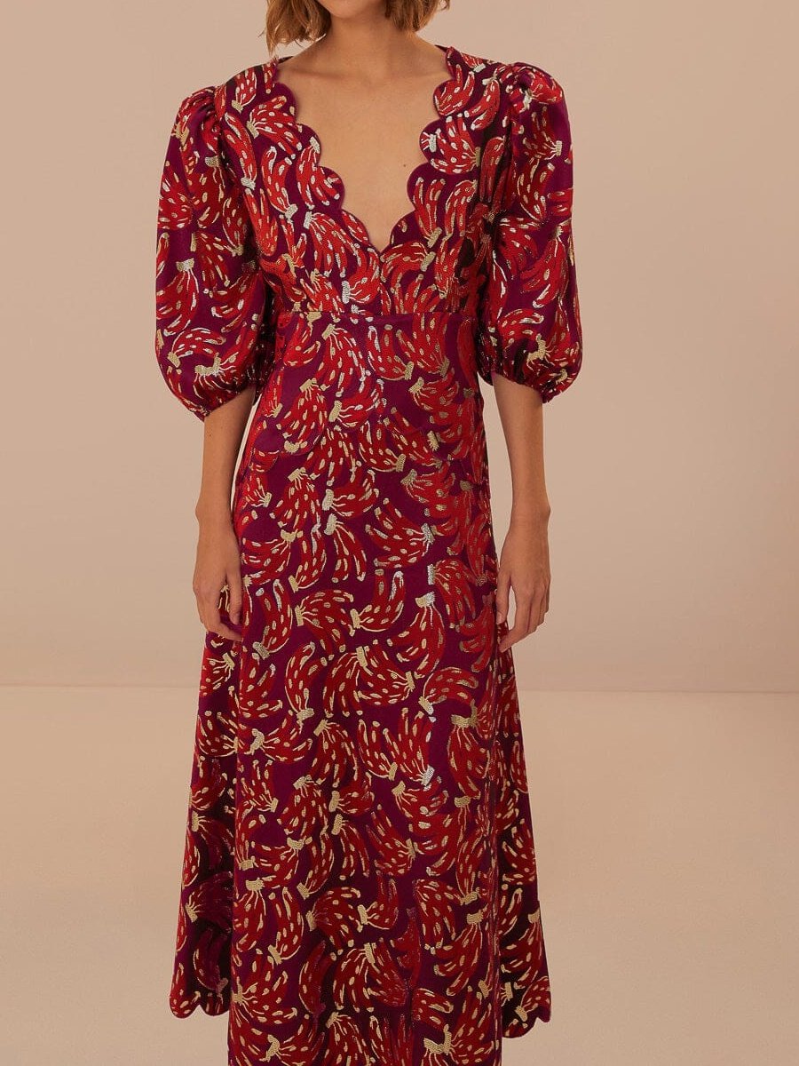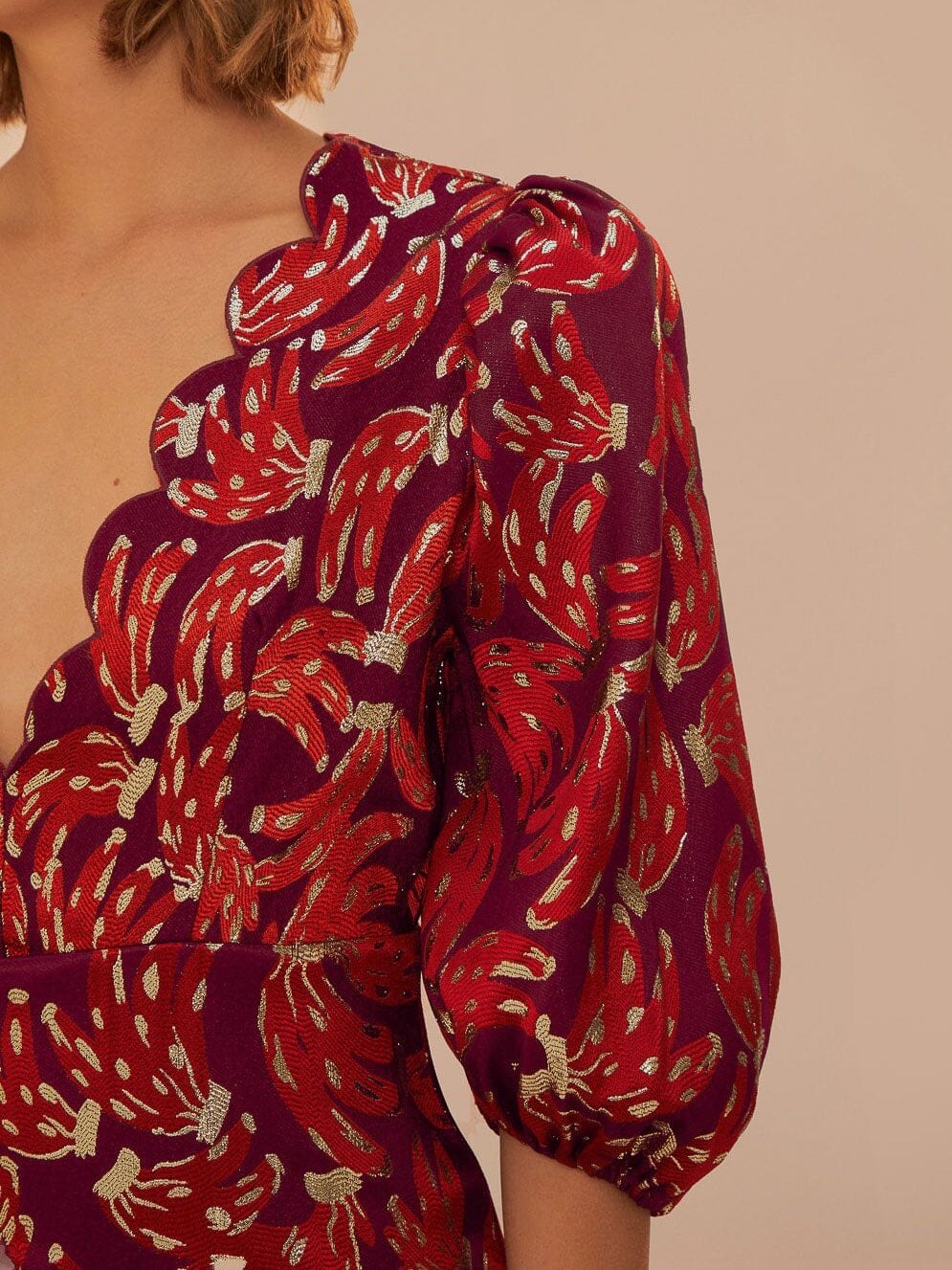 Embrace a tropical vibe with the Burgundy Banana Jacquard Midi Dress. Infused with an enchanting banana leaf jacquard pattern in shimmering gold against a deep burgundy backdrop, this dress features a figure-flattering silhouette with a cinched waist and gently puffed sleeves. Dive into the allure of its V neckline, and let the midi length sweep you into an effortless elegance that's uniquely Brazilian.
