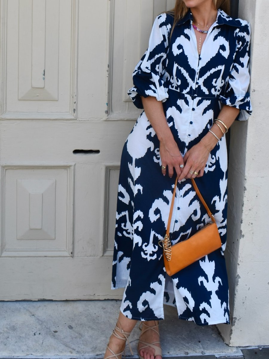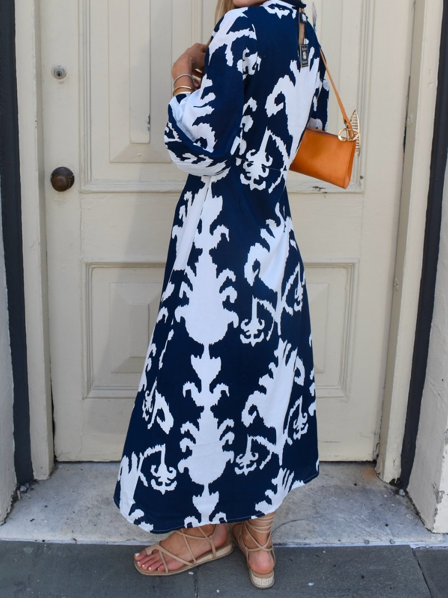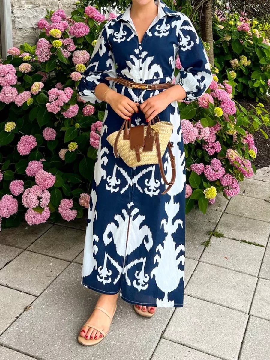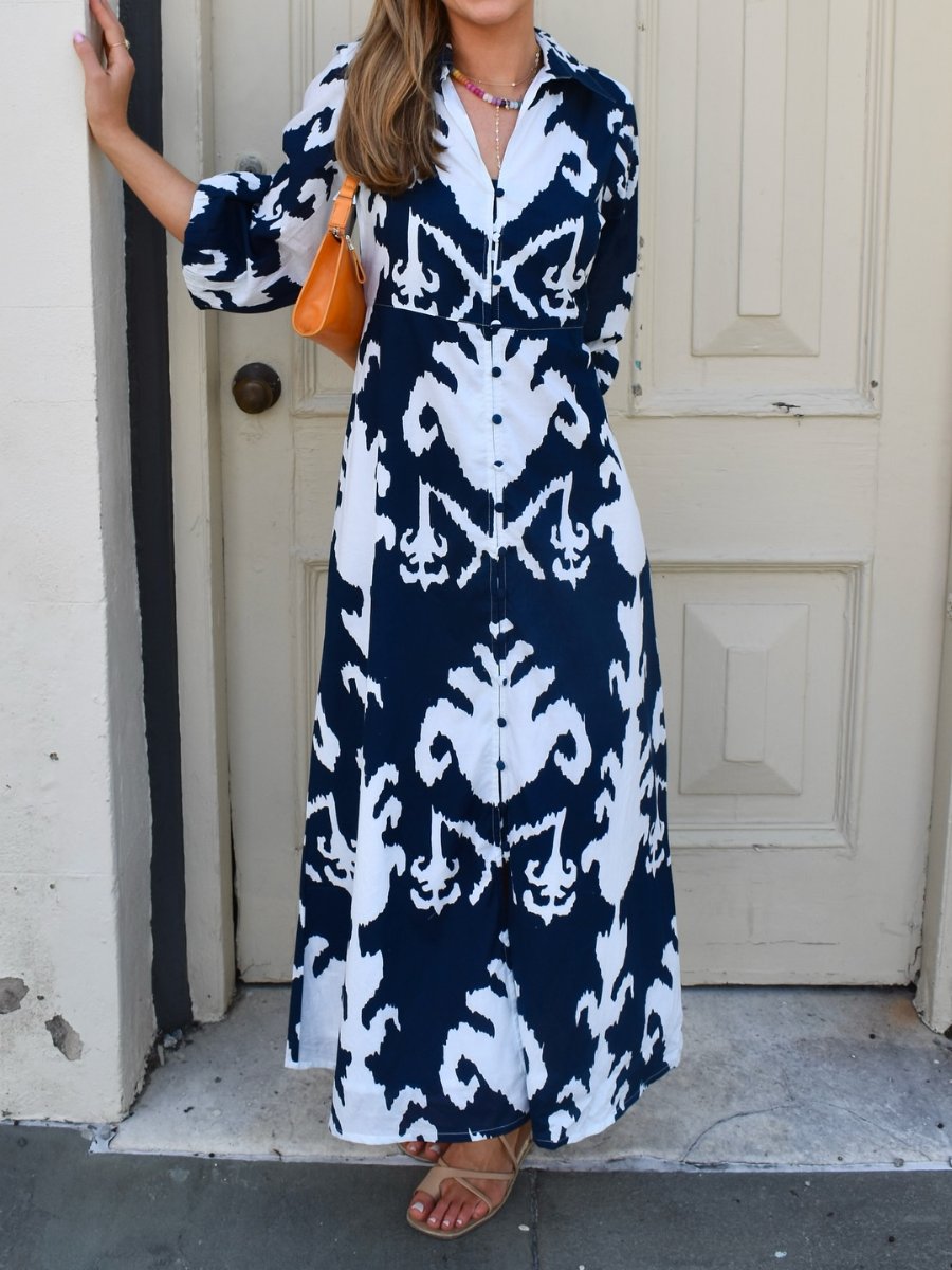 This maxi shirt dress features a striking Ikat print and is perfect for casual outings. Crafted from breathable cotton, it offers comfort and effortless style.