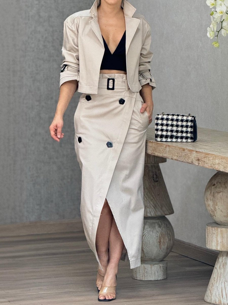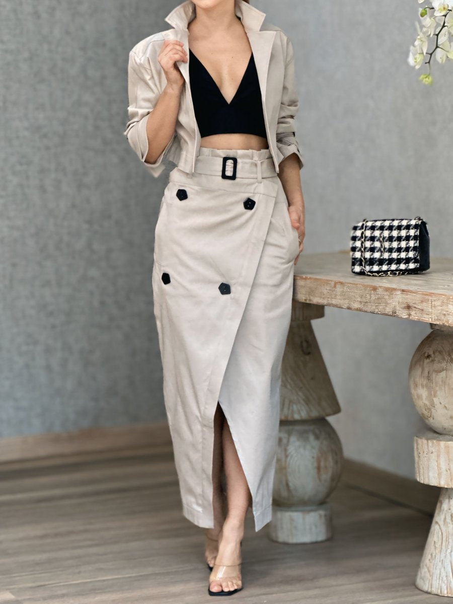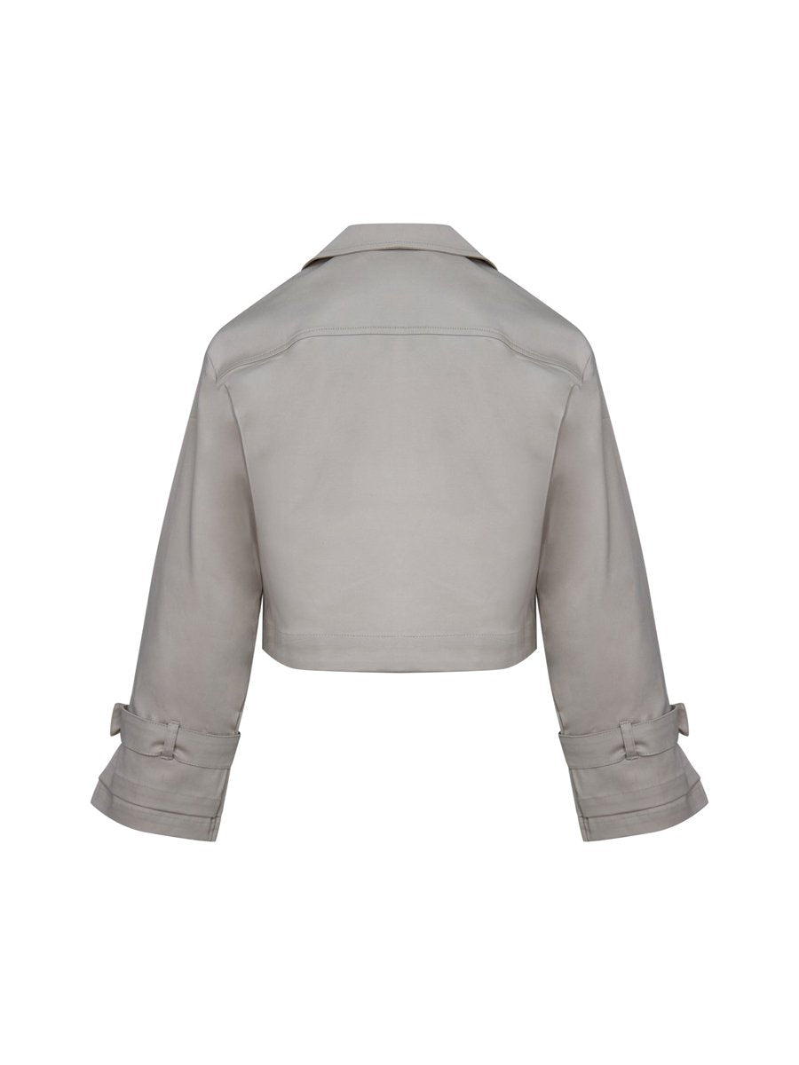 Cropped length. Drop shoulder. cuff tab. Button down front