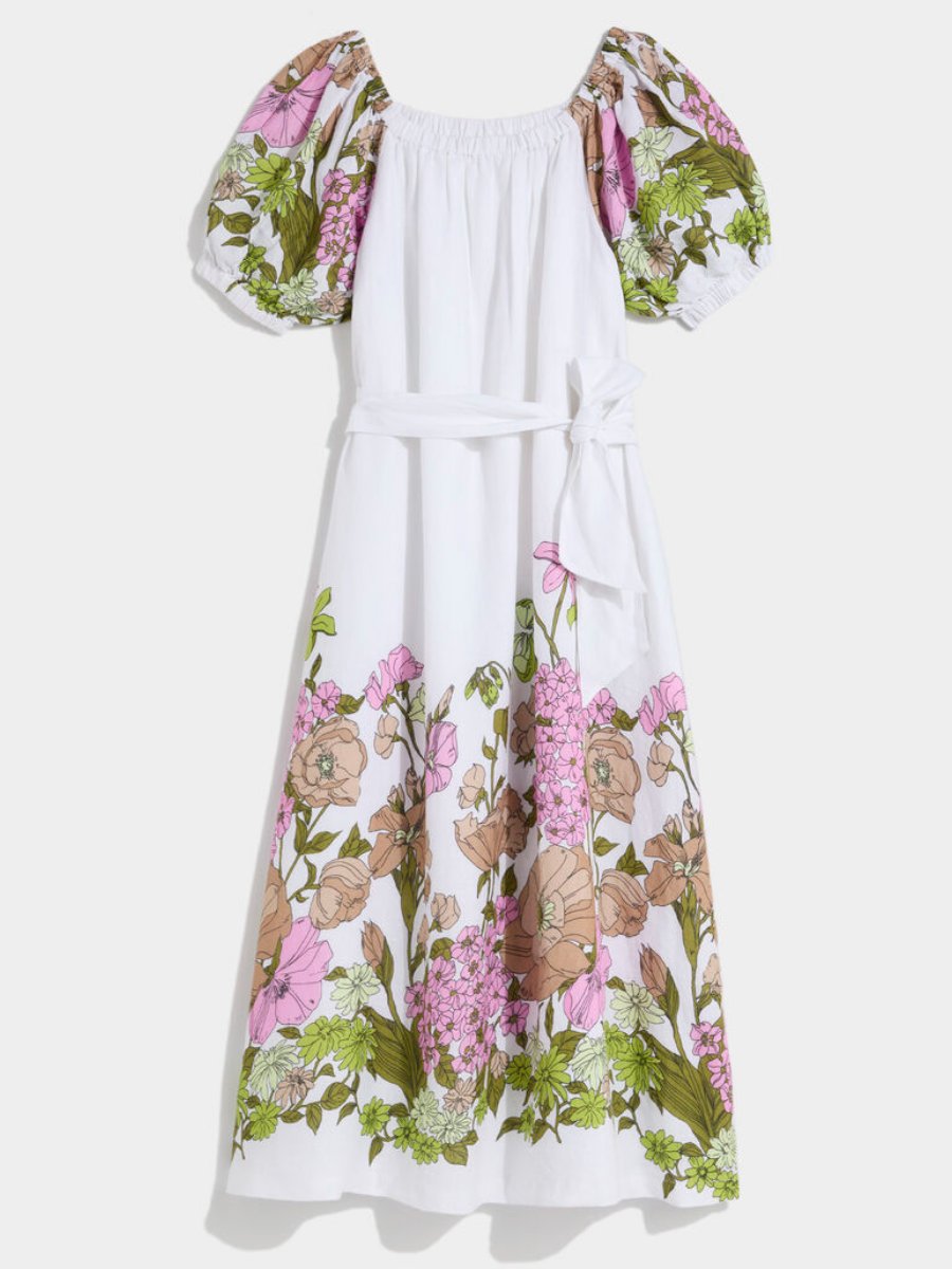 Blooms captivate on a voluminous linen dress framed by puff sleeves and cinched with a tie belt.