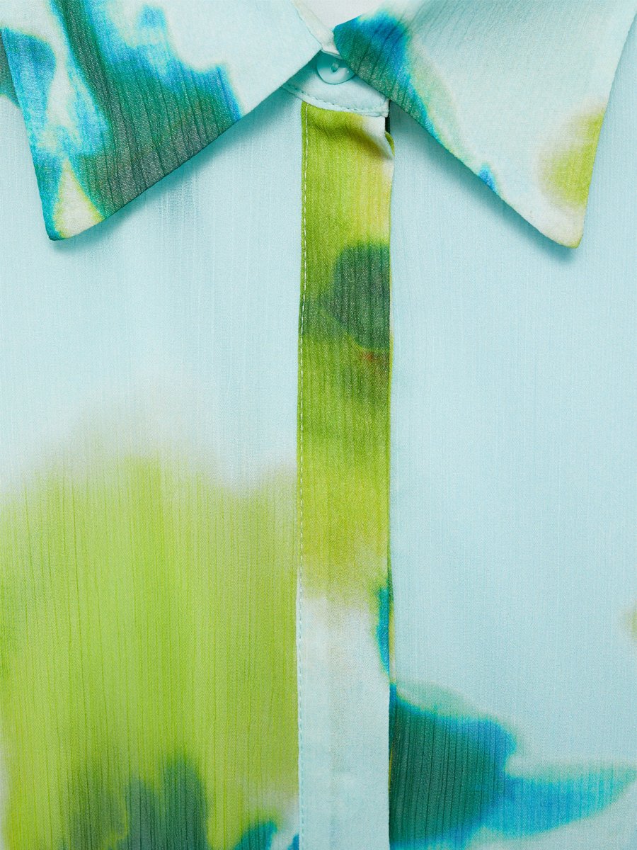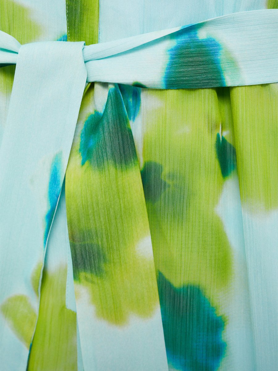 Flowy fabric. Long design. Straight design. Printed design. Shirt-style collar. Long sleeve. Front button closure. Tie closure at front. Inner lining. The model is 179 cm tall and is wearing an S.
