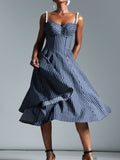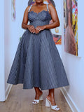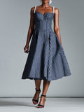 The Corset-Style A-Line Dress brings romance to denim with a structured yet flowing silhouette. Crafted from 100% thick, lightly striped cream-on-dark blue denim, this bias-cut asymmetric dress accentuates curves with a built-in corset-like cup for natural lift. Delicate shoulder straps adorned with soft pearls add a touch of elegance, making it an edgy yet timeless piece perfect for the modern, confident woman.