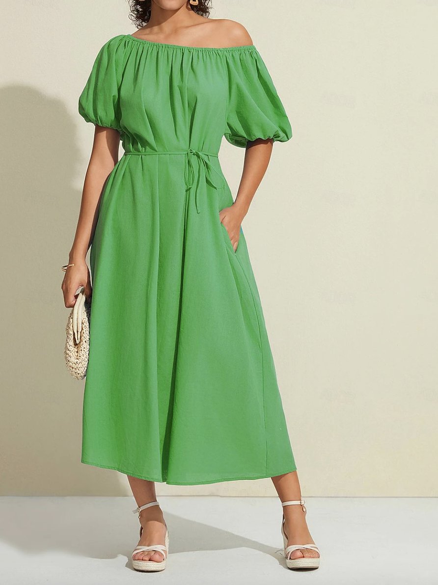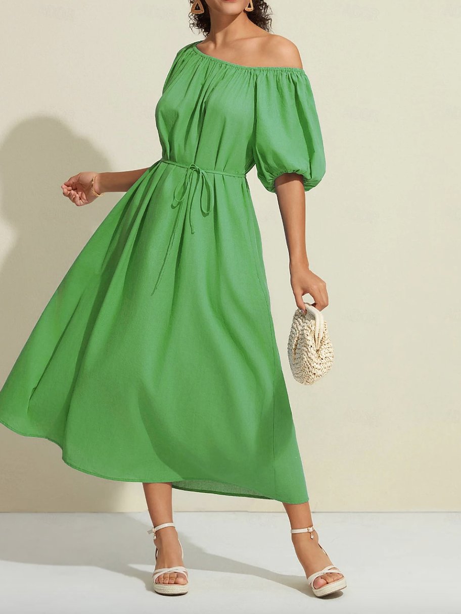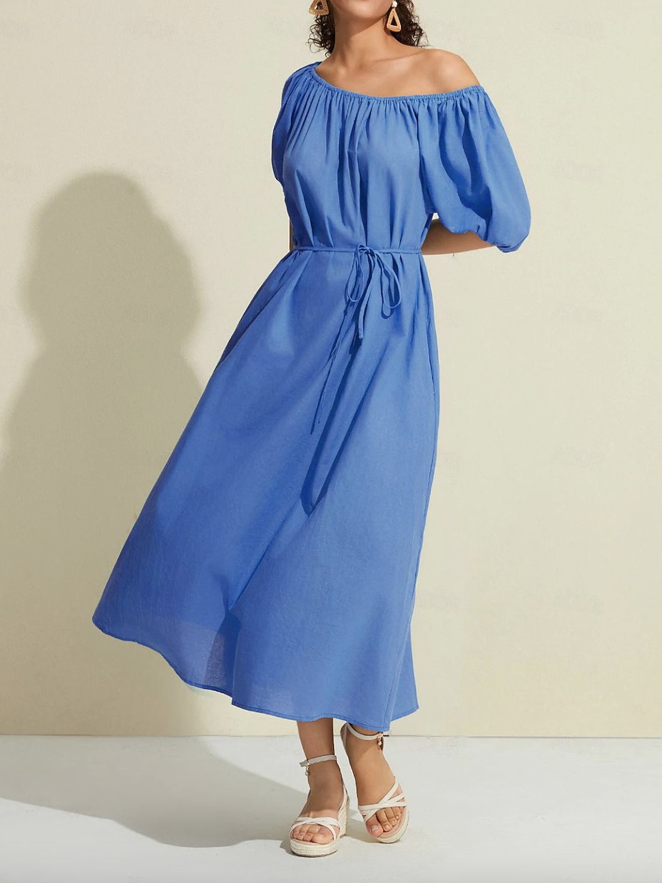 Cotton A Line Ruched Belted One Shoulder Maxi Dress