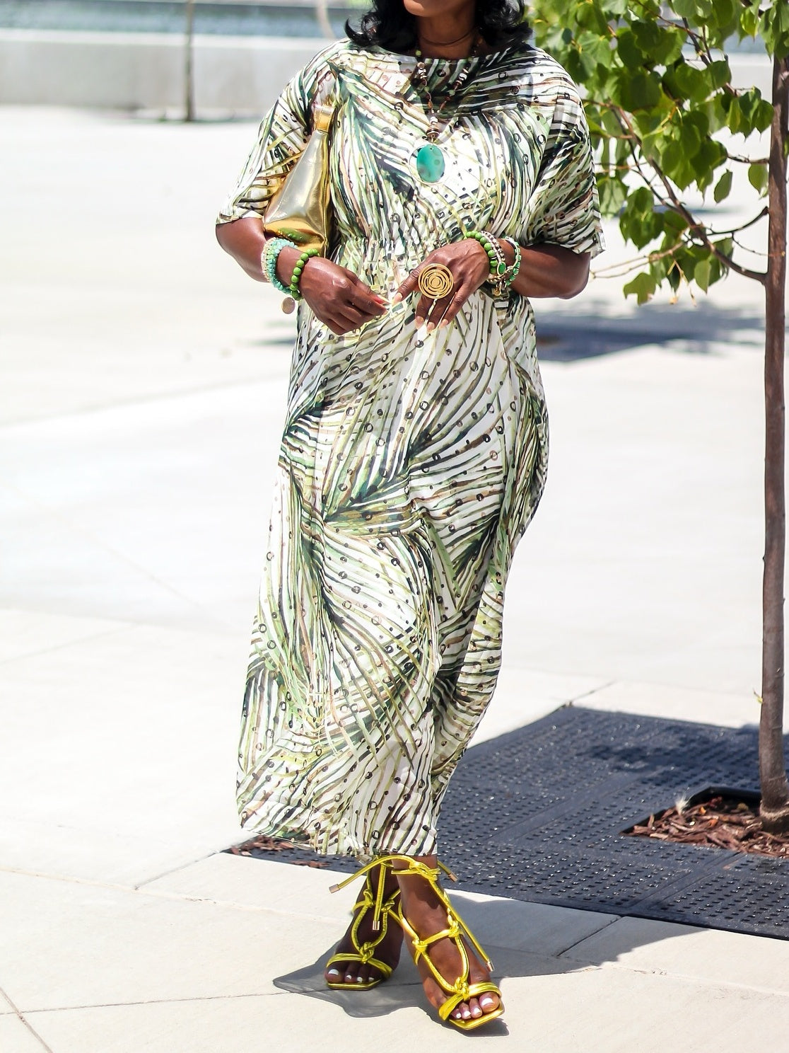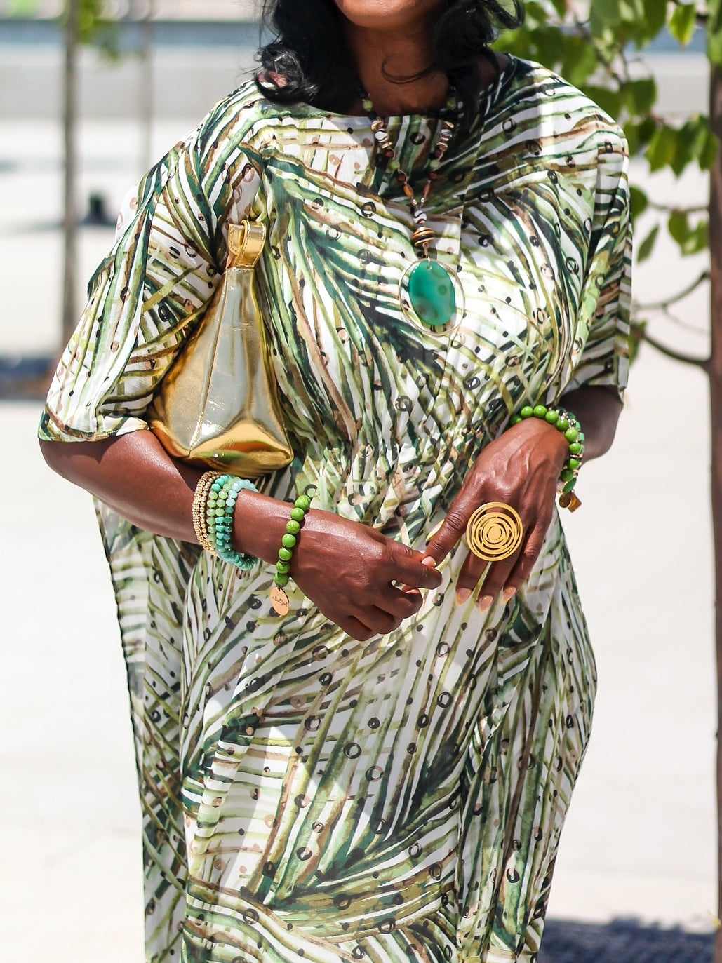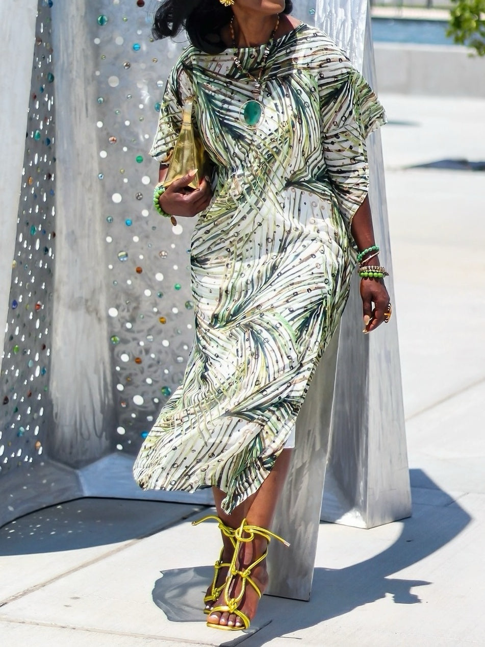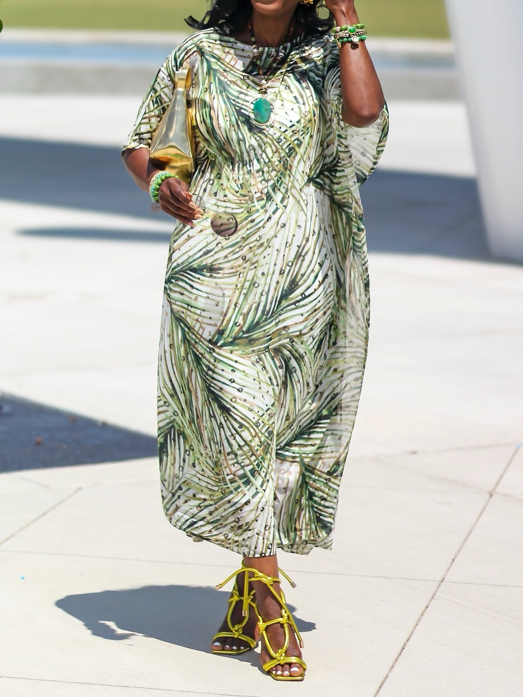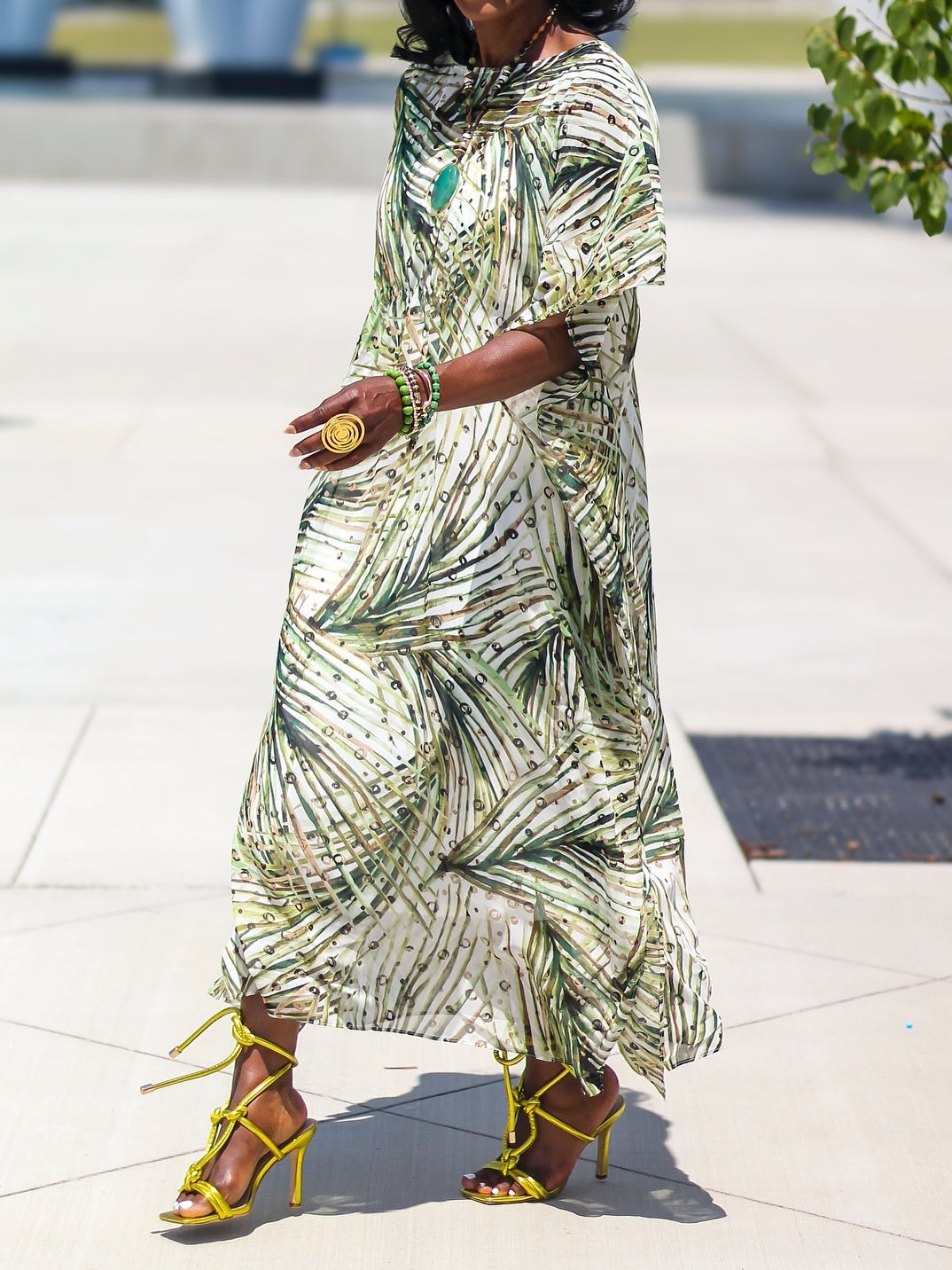 Versatile, easy, and steeped in history, the kaftan dress is a beloved bestseller. The perfect vacation dress (or to make you feel like you're on vacation)—wear by the pool, at the beach or to brunch. Maxi length with an ultra-flattering cinched waistline. A-line silhouette, elbow sleeves, and jewel neckline. Showcasing a palm-frond motif for that island feel all year round.