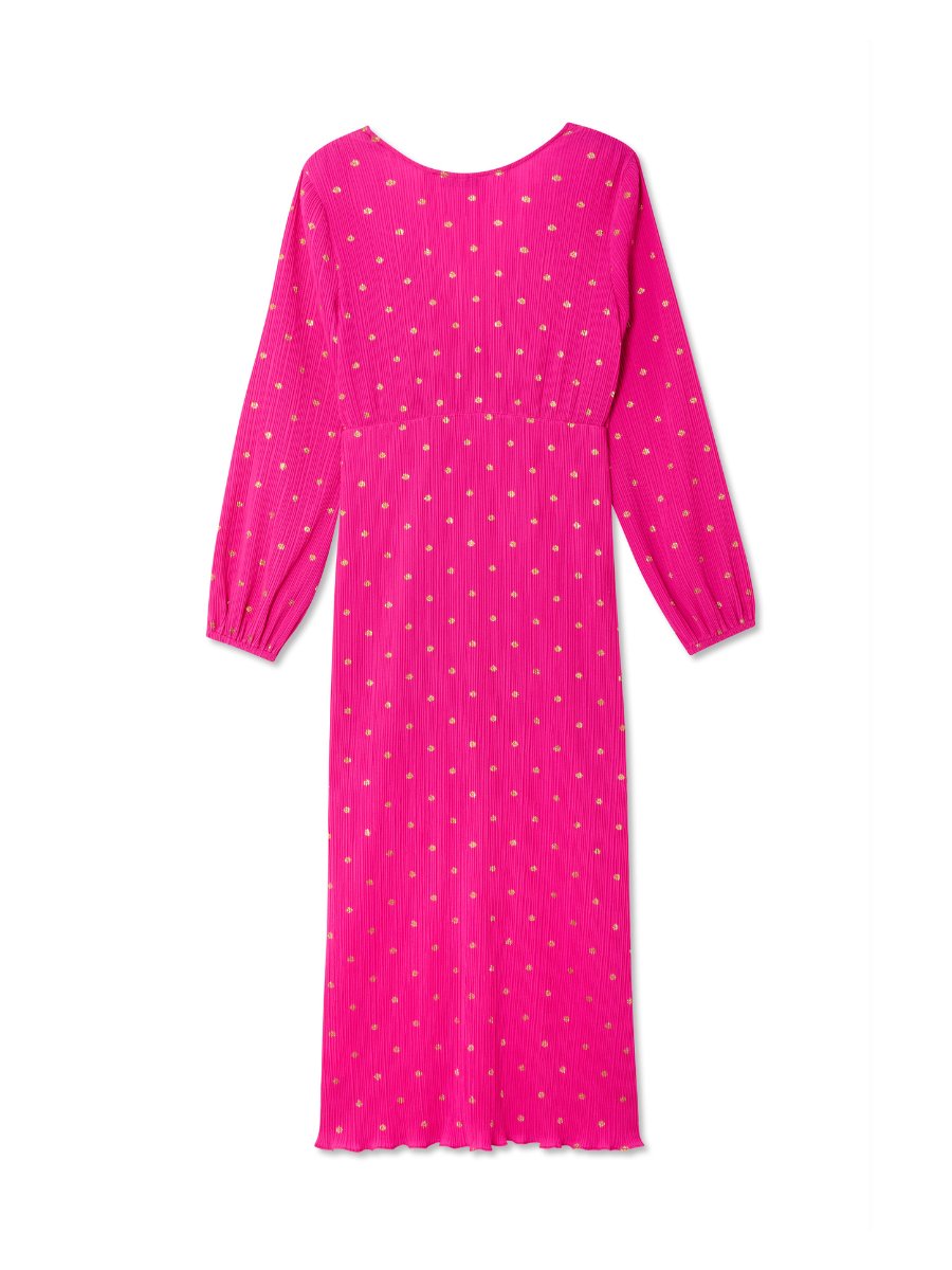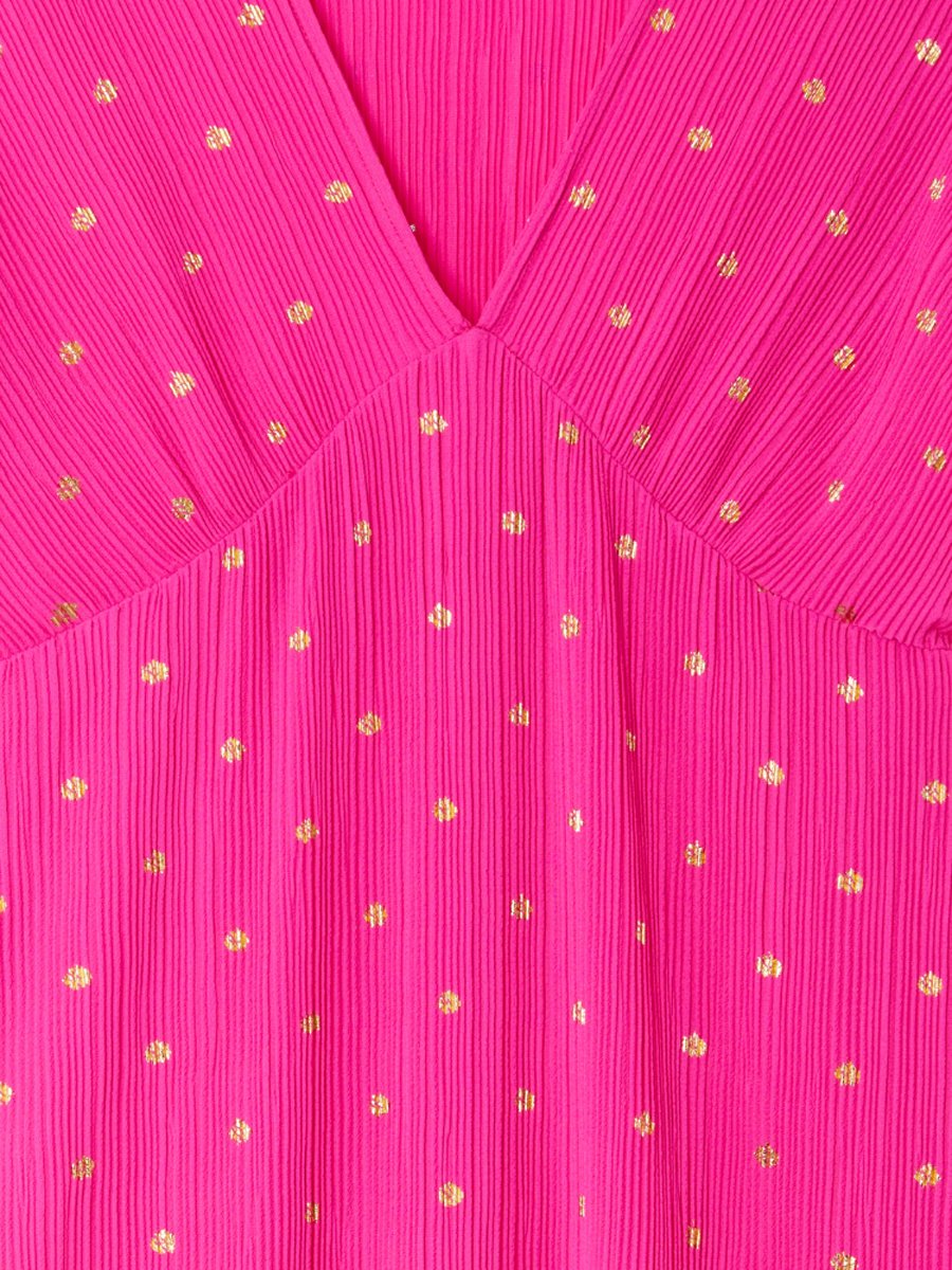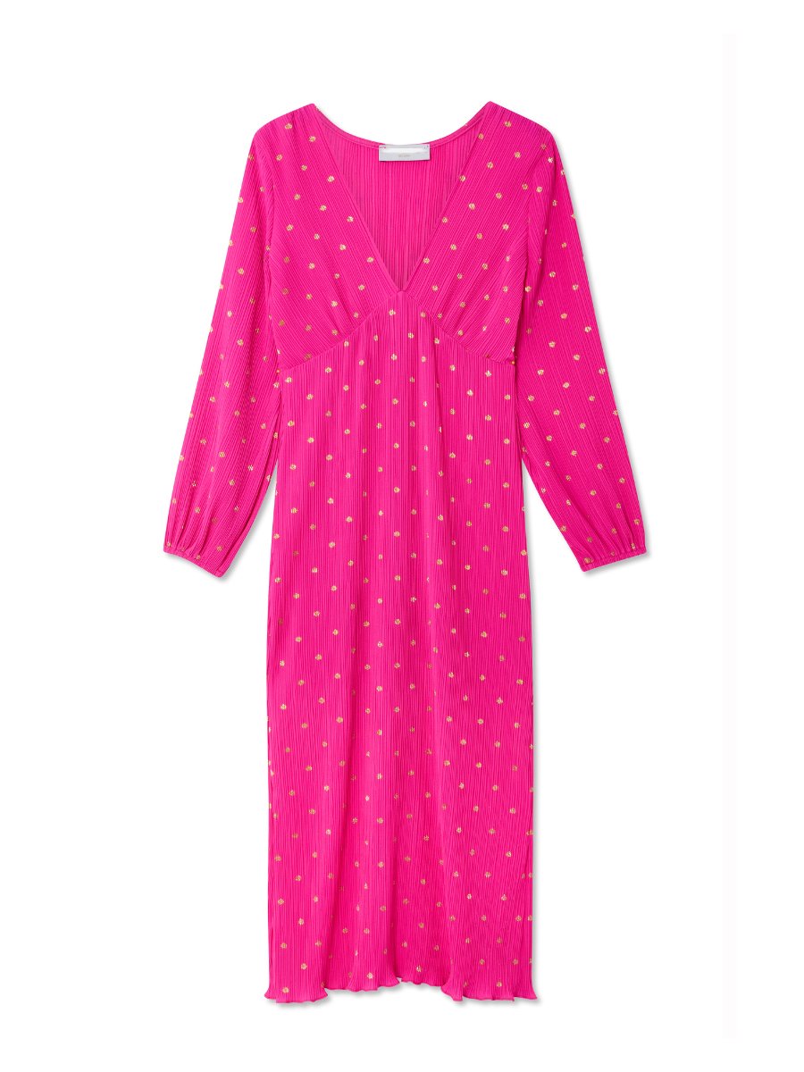 This dress is the ultimate convenience you'll reach for at every occasion. In our bestselling dress, a lightweight, stretchy fabric that feels SO premium, and really drapes the figure. In our iconic gold fleck print, it has an elasticated waist seam for flexibility with sizing, and a hook and eye fastening on the neckline so you can adjust the coverage. Elasticated sleeves ensure that you have control over the length.