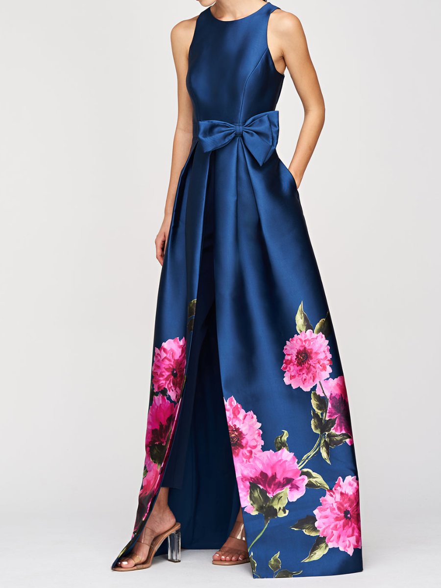 It features a pre-tied 3D bow at the waist and stretch crepe pants paired with a dramatic ball gown walk-thru skirt. Perfect for any special occasion, this jumpsuit offers a unique blend of elegance and modern vibrancy.
