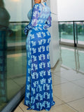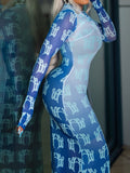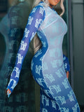 Elegant High Neck Long Sleeve Printed Maxi Dress