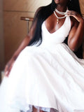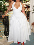 This elegant white halter dress exudes timeless sophistication, featuring a plunging neckline and a flowing A-line silhouette that gracefully enhances the wearer’s figure. With its chic design and flattering fit, it’s the perfect blend of style and comfort.