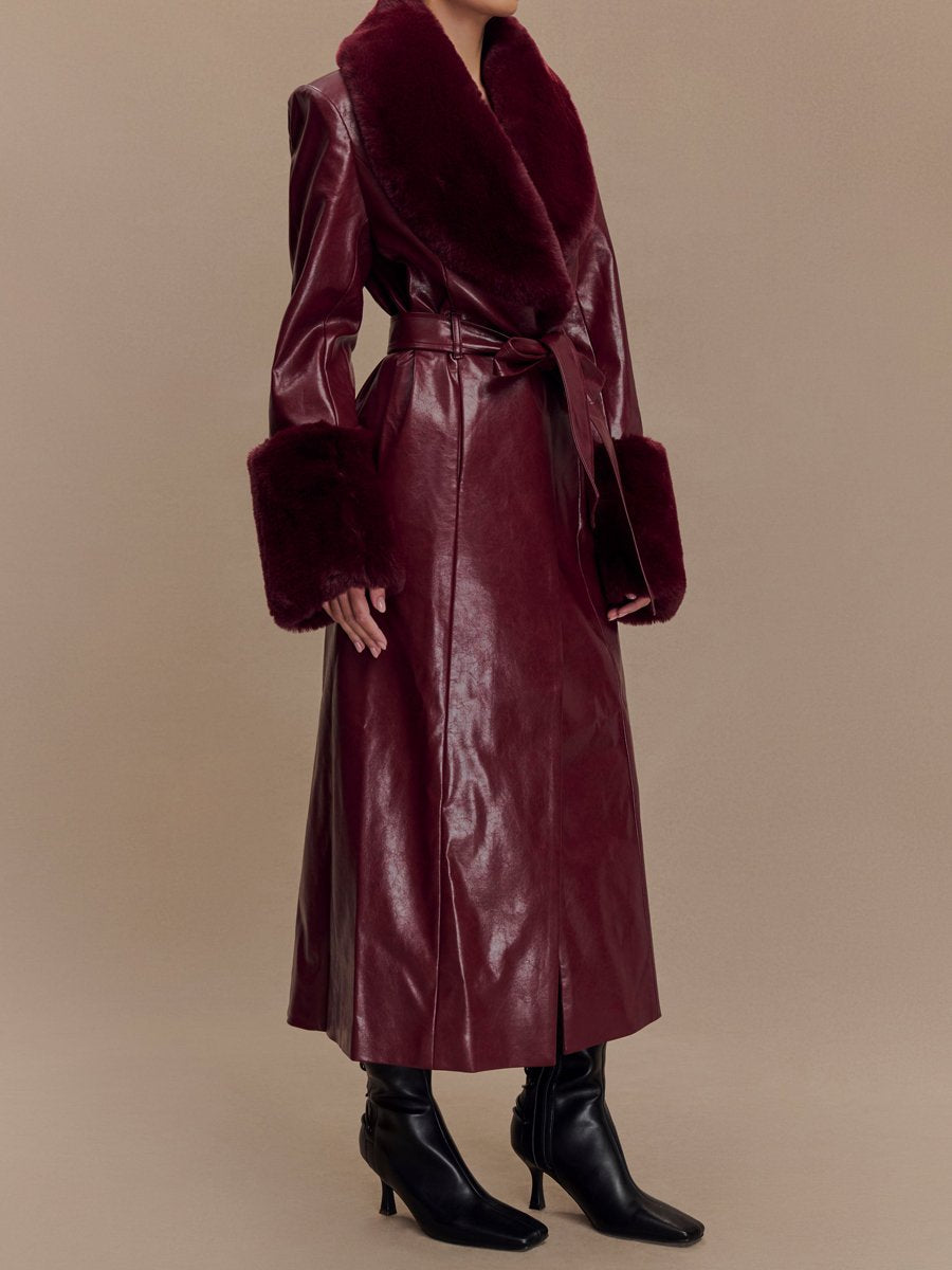 - This longline silhouette features luxurious faux fur trimming on the lapels and sleeves, adding a touch of glamour and warmth. The matching waist belt cinches the waist to accentuate your figure, while functional waist pockets offer both practicality and style. Designed with a centre back split for ease of movement, this coat is crafted from sleek patent PU faux leather for a bold, polished look. Perfect for making a statement while staying cosy, this coat is an essential addition to any wardrobe.