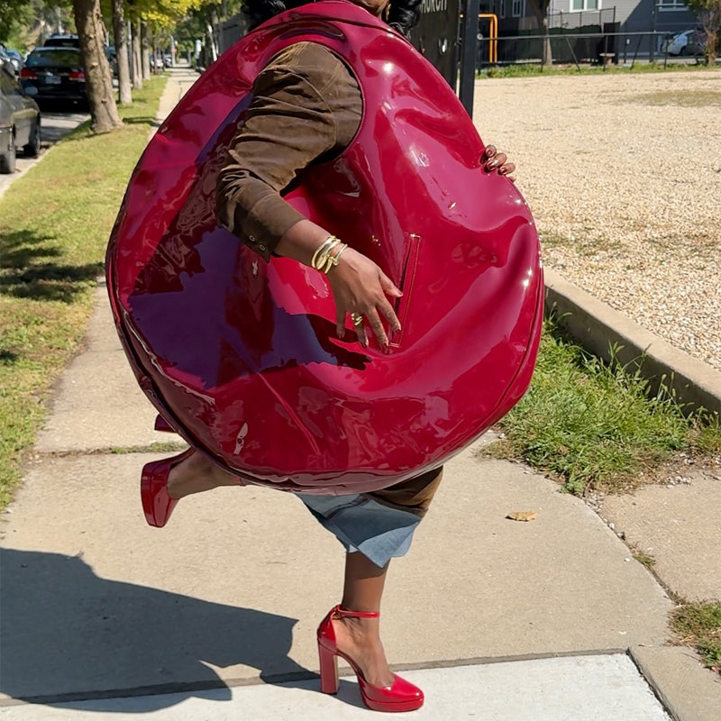 Crafted from faux patent leather in an ultra-glossy burgundy hue, this avant-garde accessory boasts a structured, oversized disc design, wide arm openings, and a strategically placed exterior pocket where you can comfortably rest your hand. It’s complete with a tonal zip-top closure and a supremely spacious, fully lined interior that can accommodate even your bulkiest essentials.