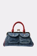 The Flight Cargo Coin Purse has ya covered! This darling bag is crafted from dark blue, acid wash denim and features a structured shape with a flat base and gold metallic frame, a push-lock top closure, attached top handles crafted from cherry red, faux crocodile leather, and coordinating faux leather trim. It’s complete with two large cargo-style pockets on the facade with magnetized button fastenings and a spacious, fully-lined interior with an additional zippered pocket.