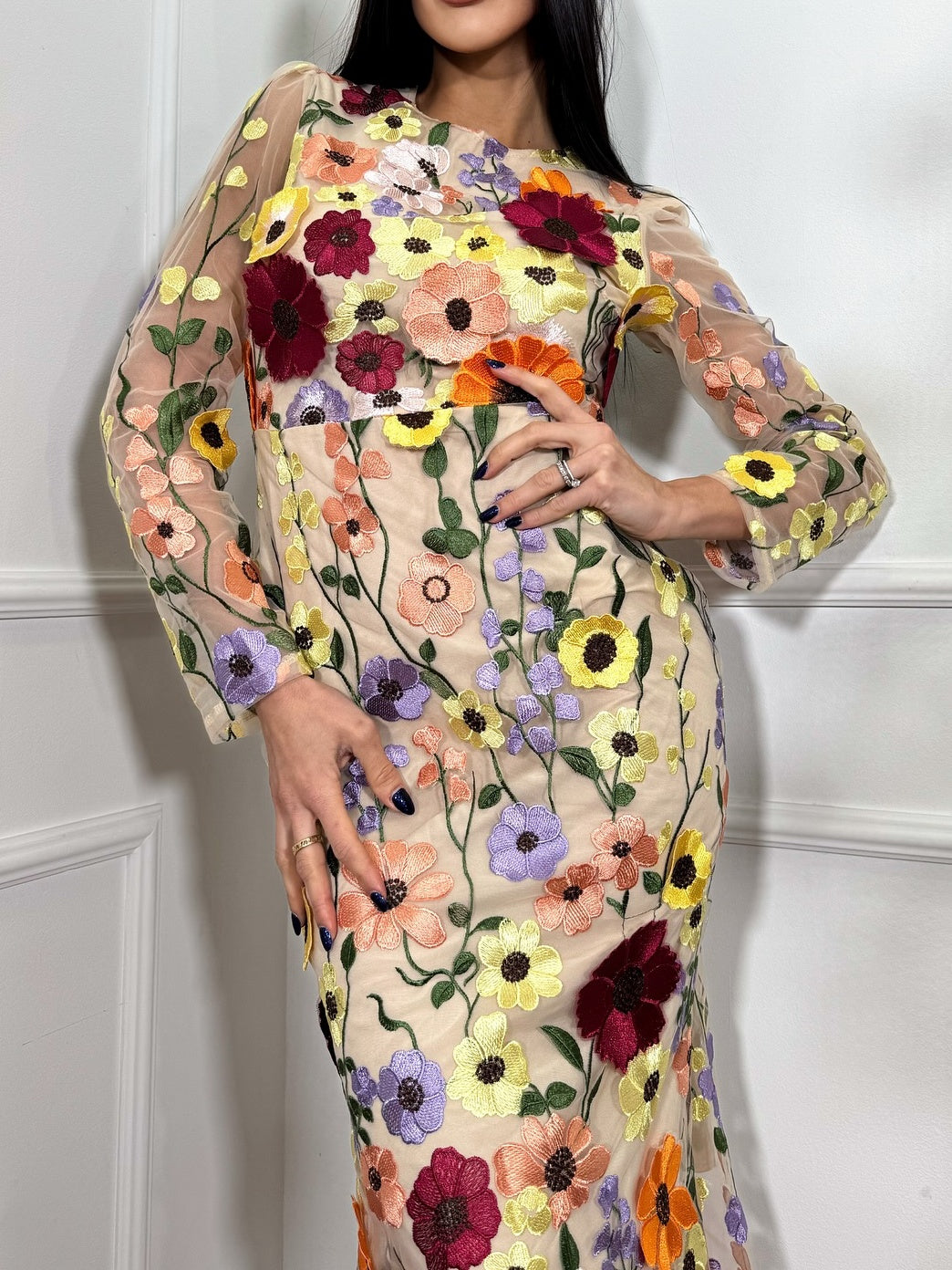 Floral Embroidered Fishtail Mid-length Dress