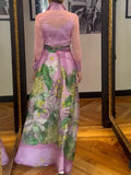 - Design: Elegant floral print with a button-down front and sheer long sleeves.