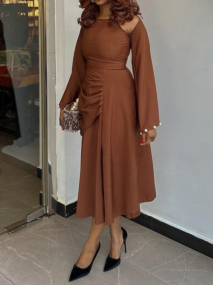 Our best selling midi length Maya Dress in four colours. The Maya Dress features our signature cold shoulder cut alongside a side drape and pearl details round the wrist. Product details: Material - Crepe Normal zipper (not invisible zipper) Fully lined dress Cold shoulder cut Please note: Production time for this garment is 7-10 working days.