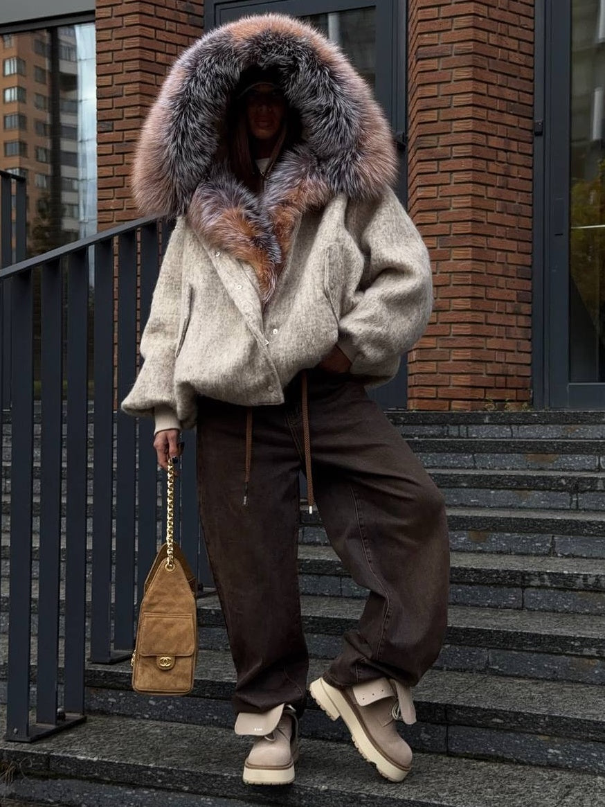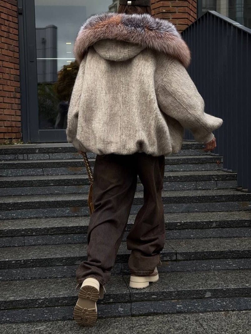 Oversized jacket made of thick premium fabric, with a wide collar made of natural fox fur in warm shades of brown and gray. The voluminous cut offers a modern air, perfectly balanced between elegance and urban attitude.