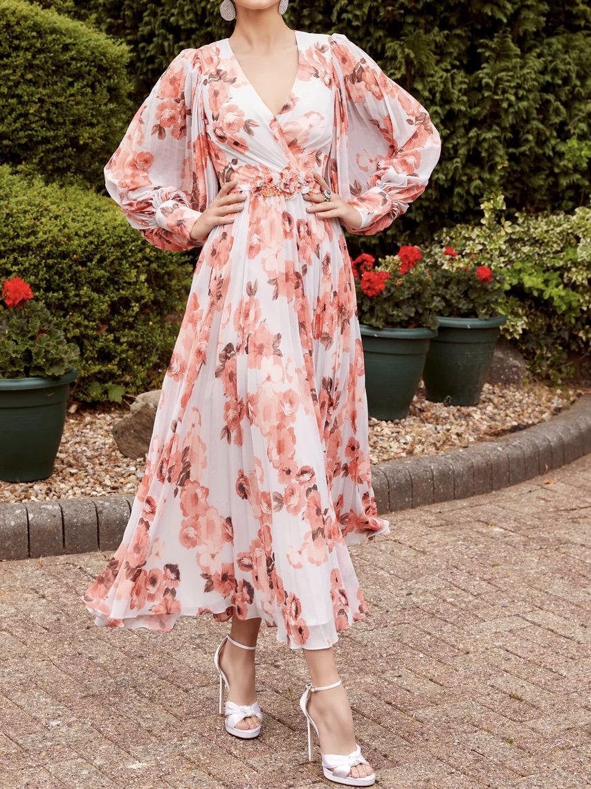 Exude feminine elegance in this stunning A-line floral dress. This timeless calf- length dress features pleated bishop sleeves and 3D floral belt which makes it perfect for a spring wedding or day at the races.