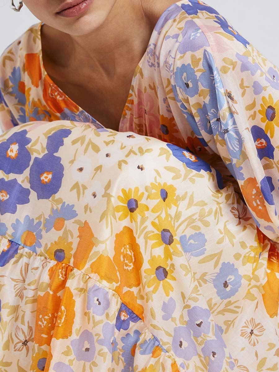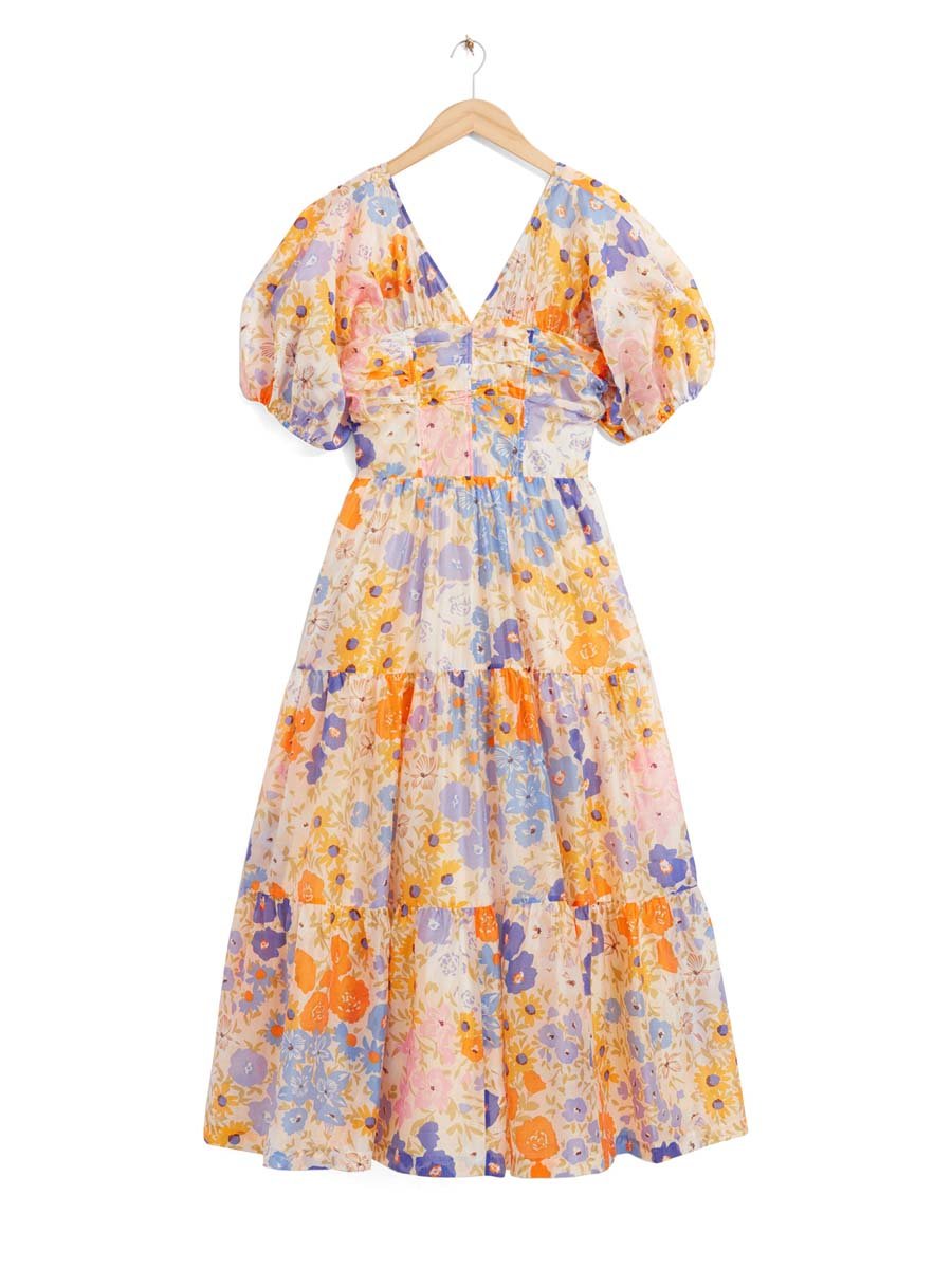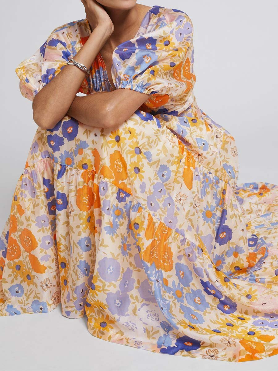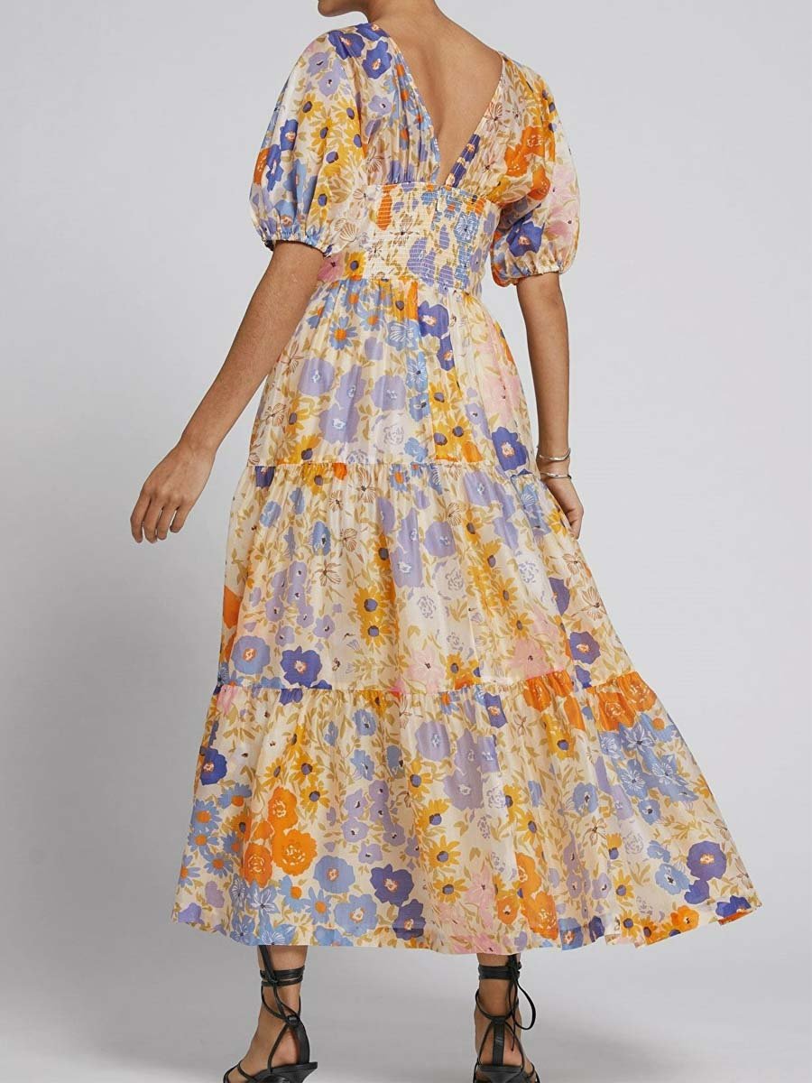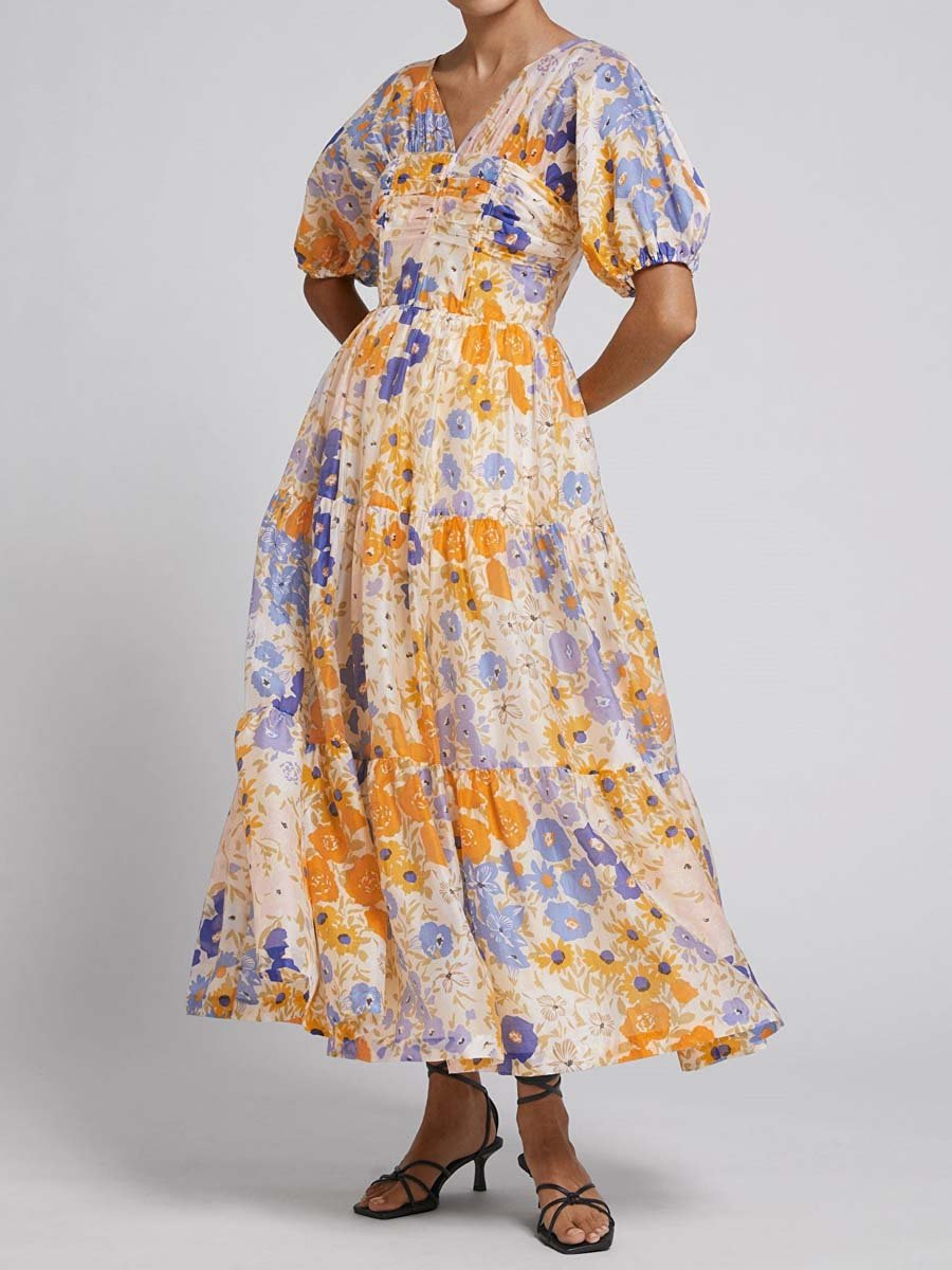【Free Shipping】Floral Print Puff Sleeve V Neck Dress